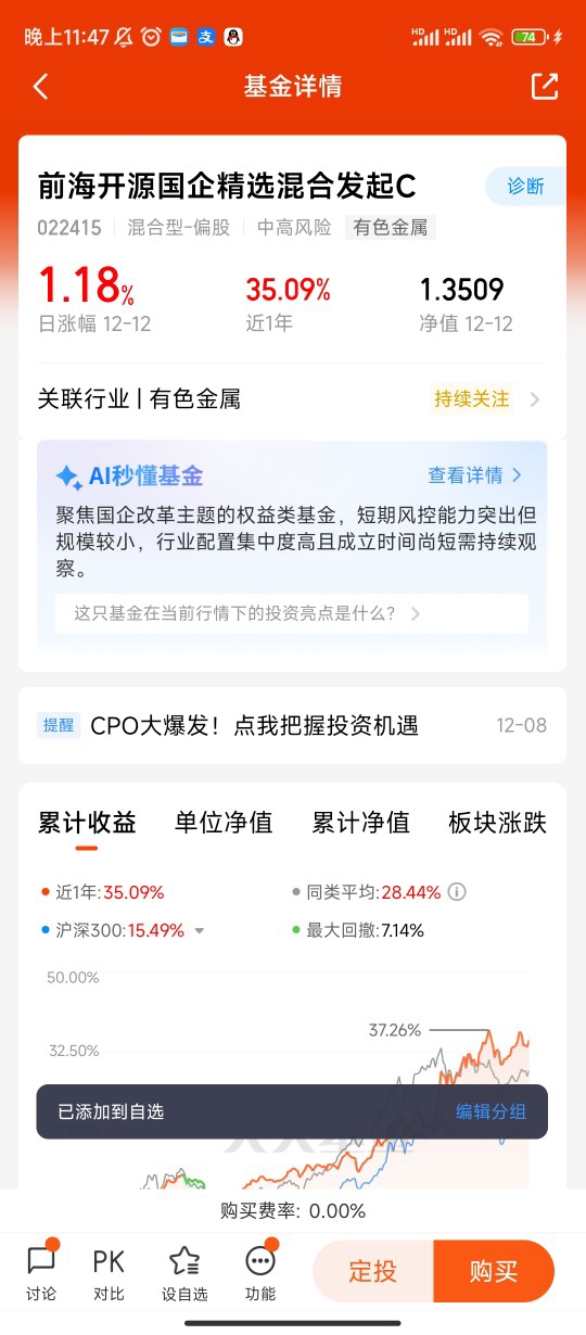 前海开源国企精选混合发起C自2024年12月6日成立以来,截至2025年12月12日,成立以来收益达35.09%,今年以来收益35.02%,近一年收益35.09%,在同类基金中排名前20%(1629/8135)。这一业绩表现充分证明了基金经理田维的投资管理能力。