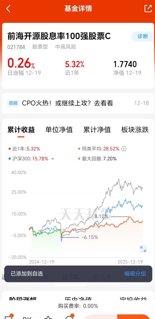 该基金自2024年12月成立以来,凭借精准的选股与灵活的配置,取得了亮眼的业绩表现。截至2025年12月,基金成立以来收益达35.09%,近一年收益35.02%,在同类8135只基金中排名1629位,处于前20%的优秀水平。这一业绩表现不仅大幅跑赢同期中证红利指数(同期涨幅1.29%),也显著超越了同类基金平均收益,充分体现了基金经理的主动管理能力。