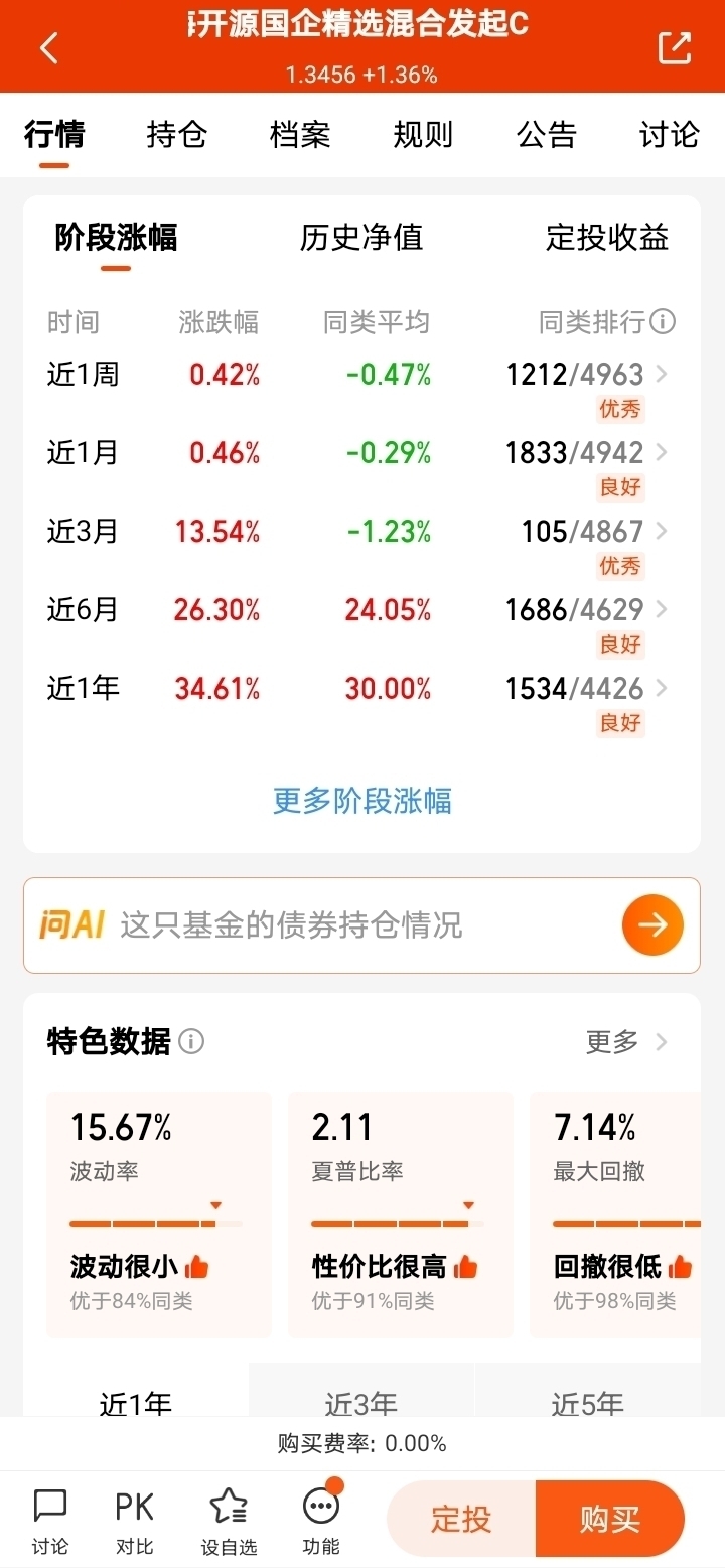 从持股来看,该基金聚焦国企,持仓个股既拥有成长性,分红又比较稳定,表现能涨的同时,还比较抗跌,历史最大回撤为7.14%,优于98%的同类基金。夏普比率为2.11,投资性价比高于91%同类基金。