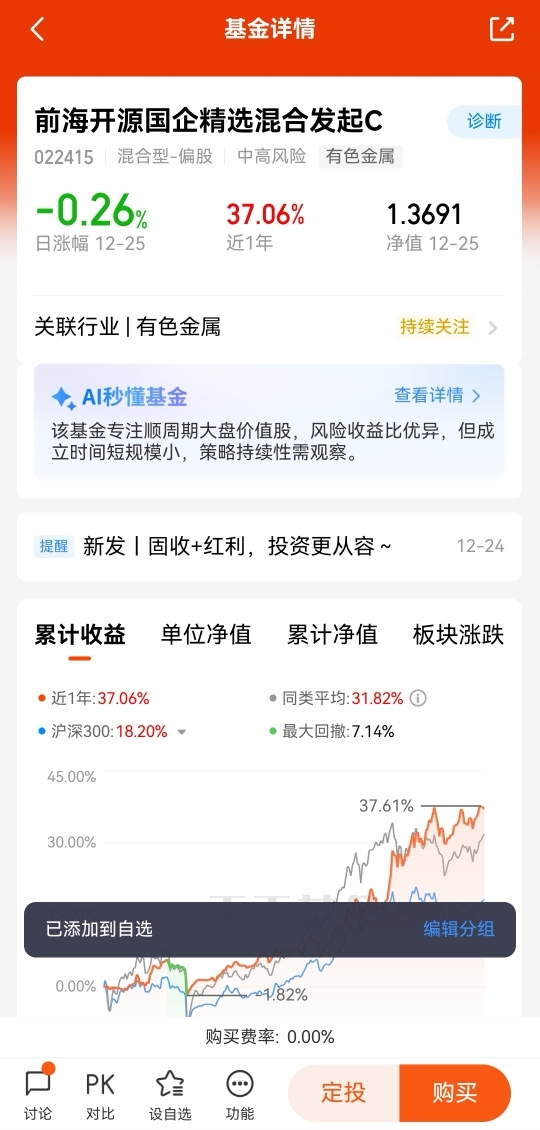 通过聚焦优质国企,找准基金整体核心定位,精选行业龙头,现金流稳定且具备战略意义。在新“国九条”的加持下,企业分红能力加强,能够拔高这些龙头企业行业特色定位,同时有能带动行业向上弹性发展。灵活配置周期与价值共振的股票组合,最新持仓中,前瞻性着重布局有色金属,凸显进攻性,同时保有非银金融、银行等传统行业,兼具防御性,整体上呈现分红稳定+进攻弹性的双重特性,近一年收益超37%,大幅跑赢沪深300。