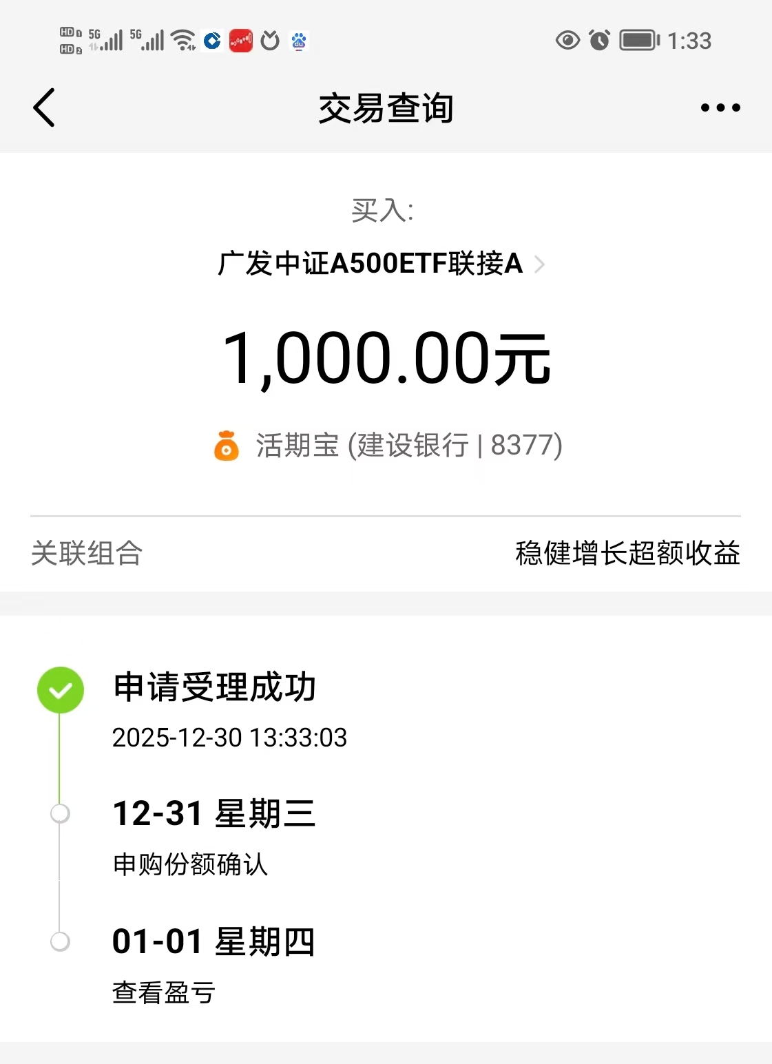 1.中证A500:我今天继续加仓$广发中证A500ETF联接A(OTCFUND|022424)$1000元。本基金是中证A500指数的ETF联接基金。该指数从各行业选取市值较大、流动性较好的500只股票组成。指数近2年涨38.27%,近1年涨20.56%,近6月涨22.58%,近1月涨t3.67%,rp1周涨1.08%,成长性相比许多宽基指数要更稳定且优秀,是A股兼顾稳定性与成长性的代表性宽基指数,其成分股也被投资者广泛认为是A股的核心资产,成为投资者一键布局A股核心资产的理想工具。近期A股表现强势,沪指9连阳。今天大盘三大指数已经集体红盘,沪指有望十连阳。虽然每天的热点不同,轮动太快,很难把握,我通过布局本基金,一键做多A股,享受它整体慢牛的收益也不错。它的A份额现在居然是零申购费,若能安心长期持有,还可免销售服务费,综合折算后持有费用便宜了30%。这种机会确实很难得,毕竟省到也是赚到。我对A股接下来的行情非常有信心,今天继续加仓它。下面我晒一下买入操作记录: