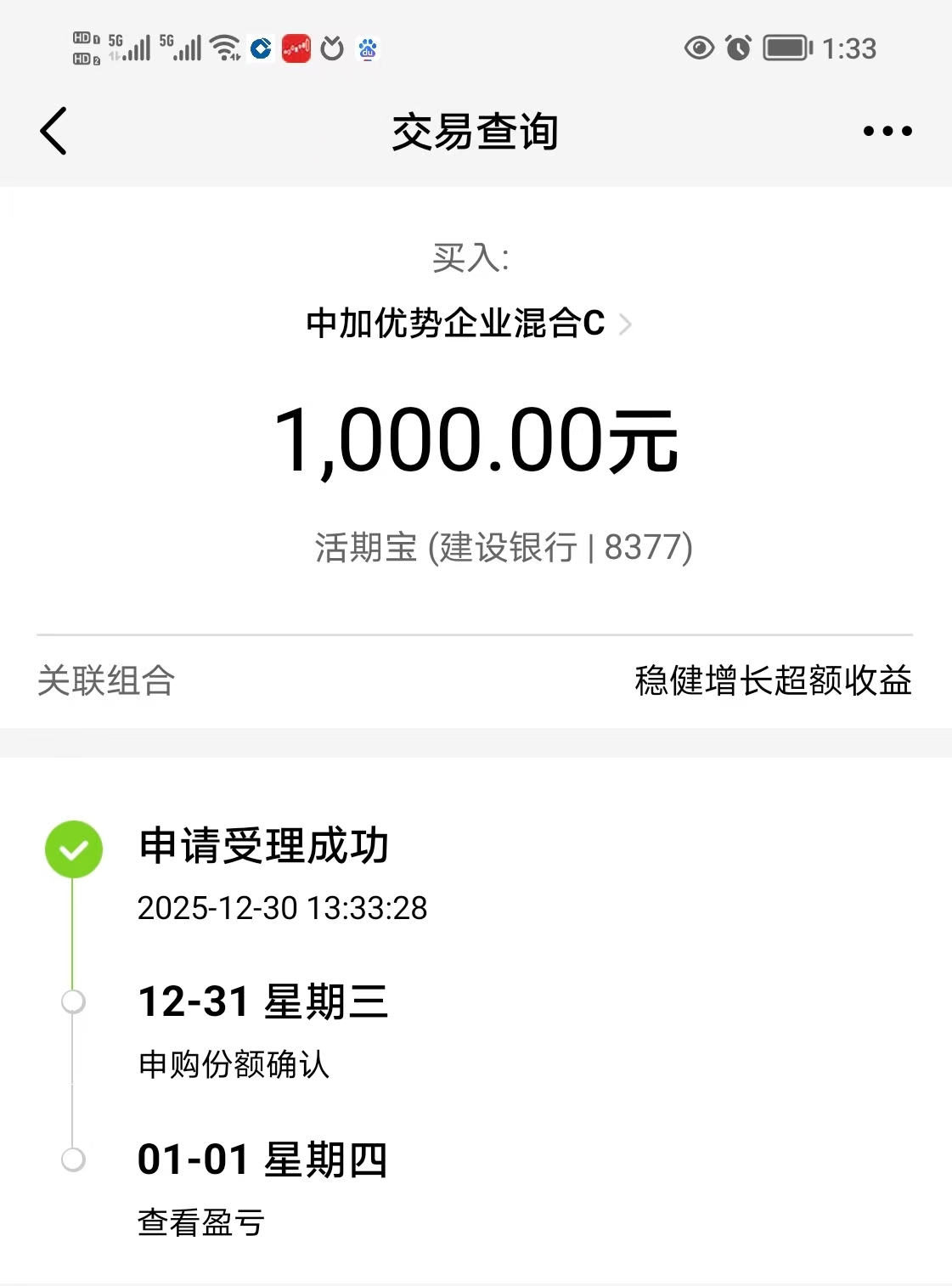 2.航空航天:我今天新建仓$中加优势企业混合C(OTCFUND|009854)$1000元。这支基金刚刚完成调仓,最新重点布局了航空航天方向。不要问我是怎么知道的,非要问我就告诉你绝招,我通过12月24日到昨天的净值表现推算的。24日它涨了4.26%,25日涨了6.67%,26日涨了3.90%,昨天 天又涨了3.42%,连续四天与航空航天方向基本一致,所以大概率是重点布局了航空航天方向了。近期马斯克SpaceX对火箭卫星发射进步明显,低轨卫星资源愈加紧缺。这也倒逼我们加快可回收火箭发射试验,推进技术创新,加速行业落地。预计到2030年市场规模或破200亿美元。亚轨道旅游规模化,轨道旅游起步,太空旅游市场约50亿美元。近期资金已经重点关注航空航天赛道,走出了持续火热行情,因此我今天也尝试建仓本基金,前瞻性重点布局该行业。下面我晒一下买入操作记录: