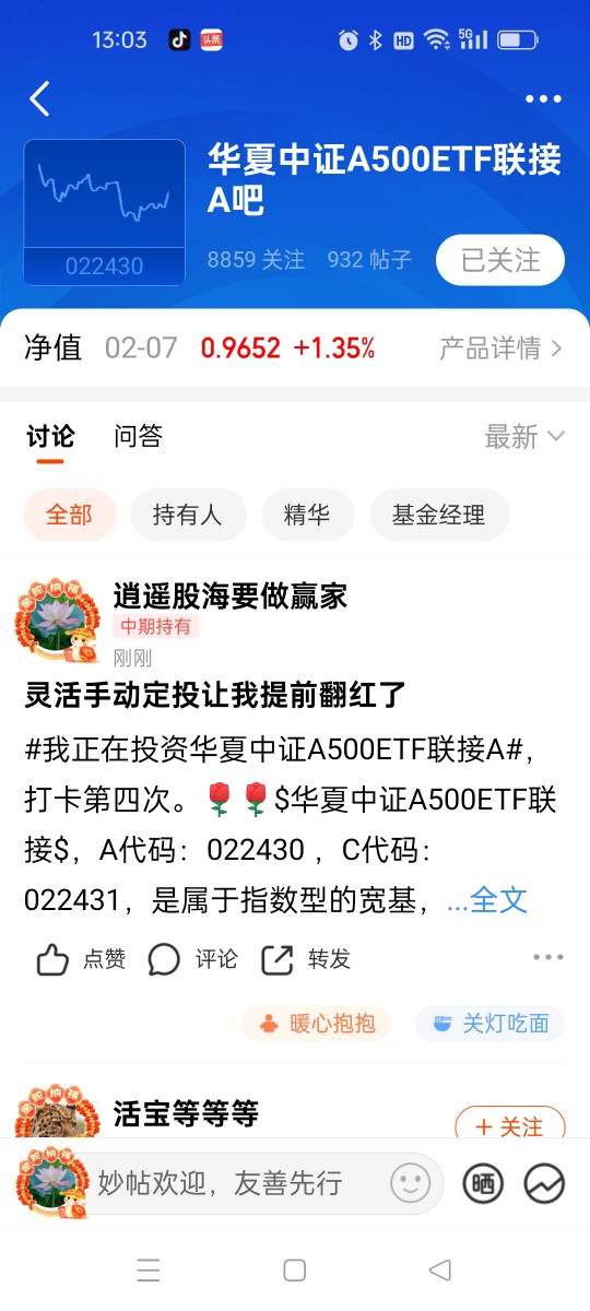 在一元发行价的下面,我为啥会提前翻红?主要是我后面一直在灵活的手动定投在补仓,这也是我一贯的操作风格。比如在一元发行价去买了一小部分,万一被套牢后,我可以再陆续的补仓位。可有的投资者大单在一元全梭买进去了,后面补仓的弹药都没有了,那现在还是翻绿的。(可看截图),所以投资任何股票型基金,都要给自己留些弹药,也要学会做勇敢、聪明又狡猾的投资者。@华夏基金 @华夏基金 经理李俊@天天话题君