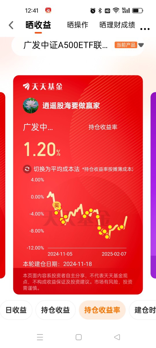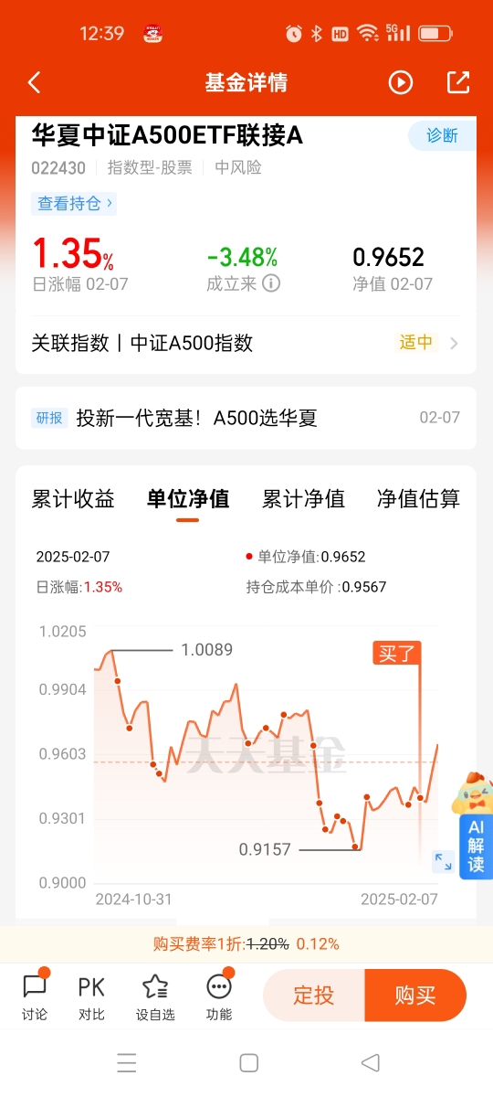 时光过的很快,在不知不觉中,我投资这个代码:022430,$华夏中证A500ETF联接A$,也有100多天了,并且在昨天正月初九翻红了,同时一起翻红的还有我持仓的另外几家基金公司的中证A500ETF联接基金,这下都是在1元下面翻红的。