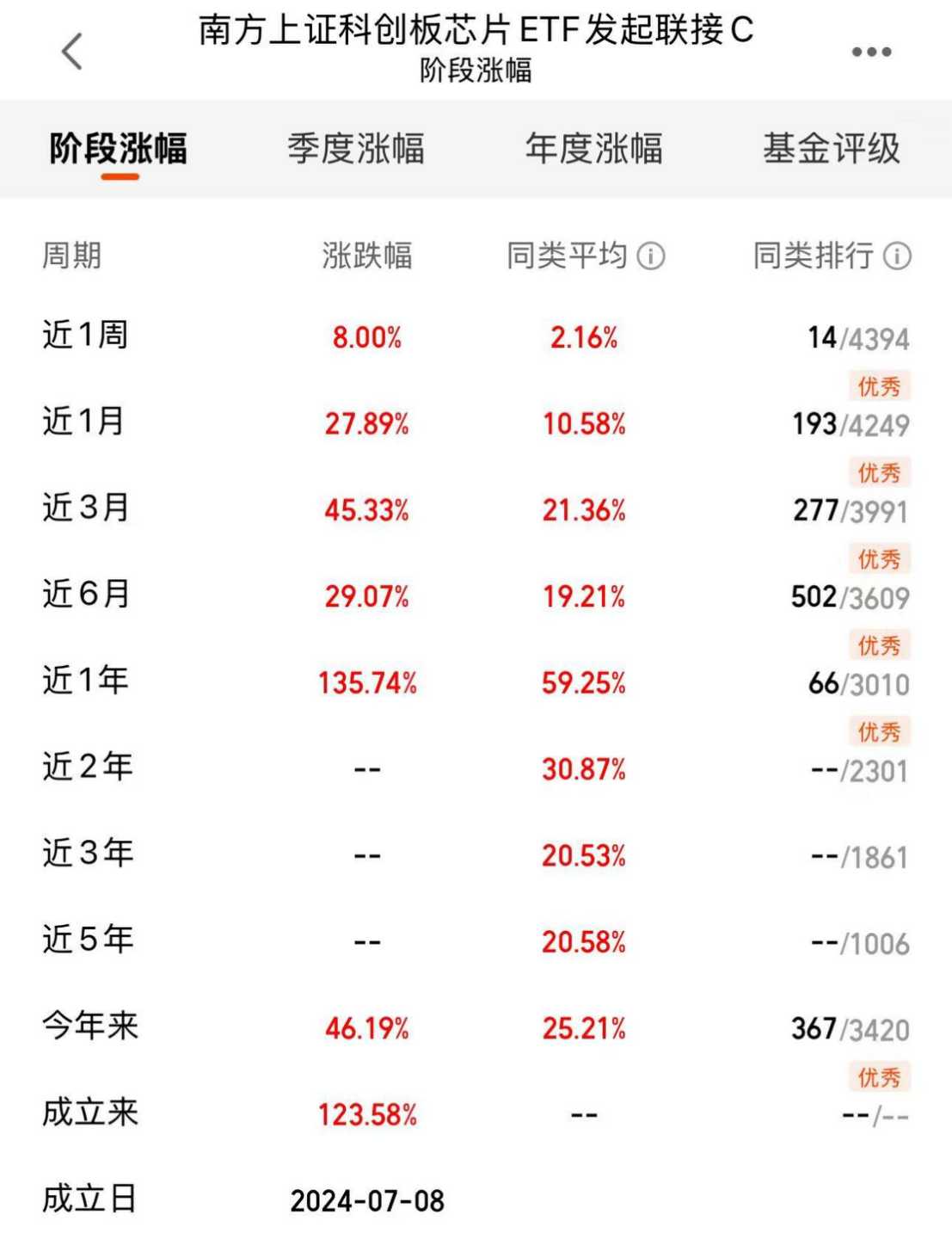 从业绩来看,近一周上涨8.00%,近一月涨幅27.89%,近三月和近一年分别实现45.33%和135.74%的回报,超额收益显著,同类产品中排名靠前。$南方上证科创板芯片ETF发起联接C(OTCFUND|021608)$