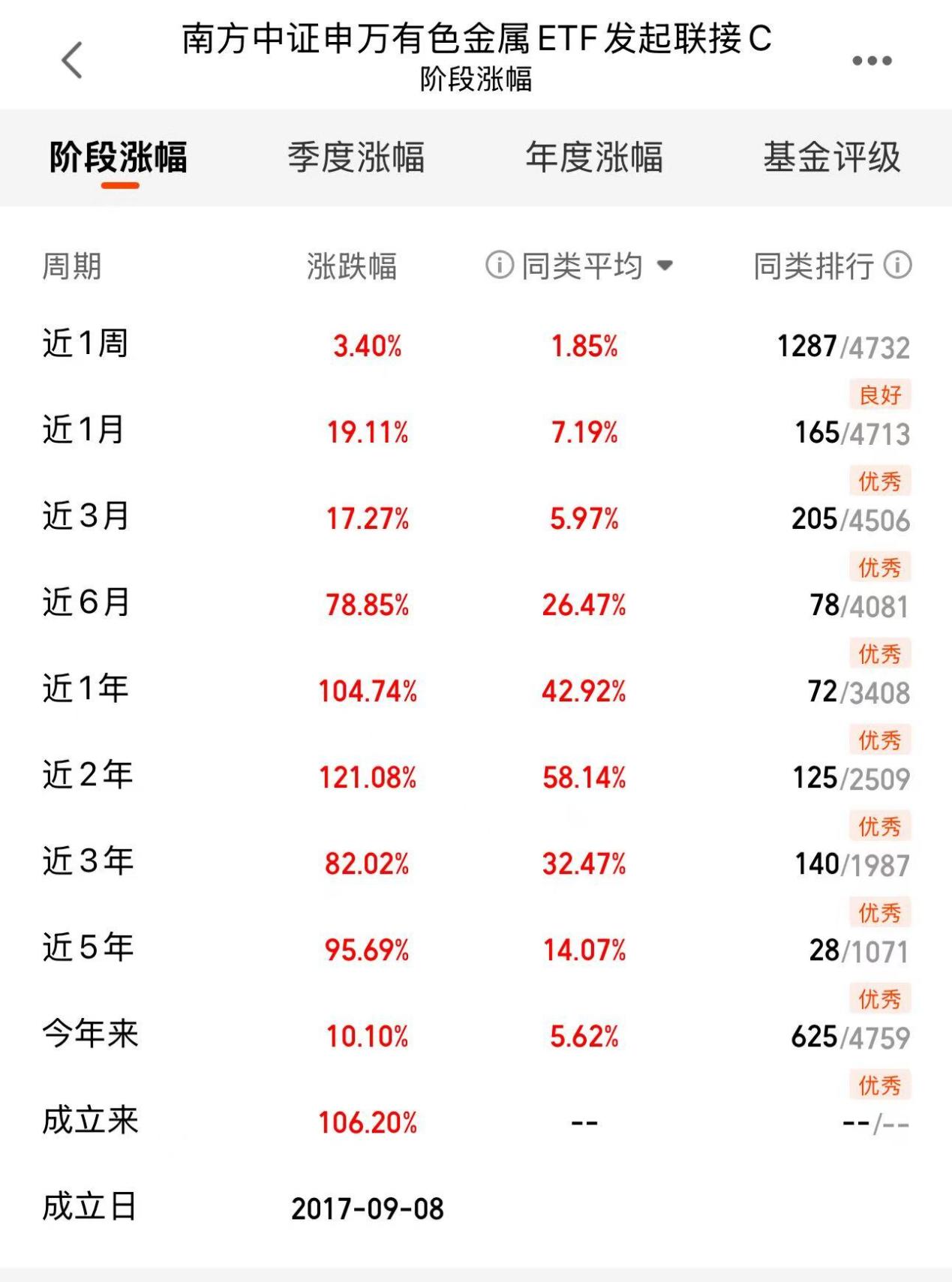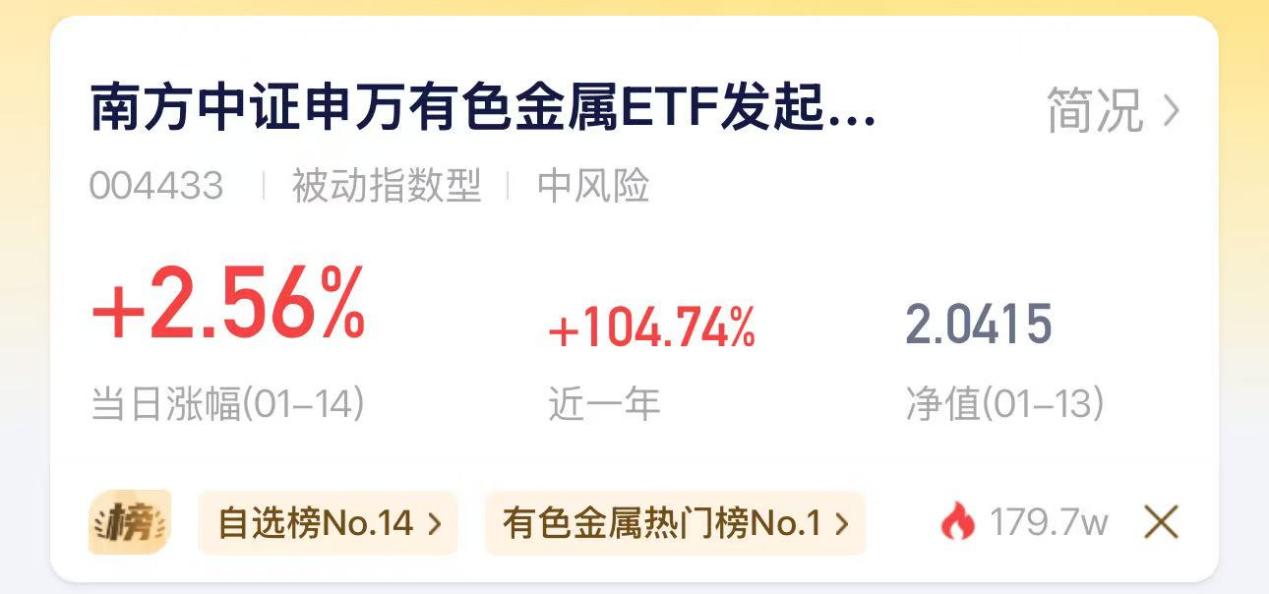 $南方中证申万有色金属ETF发起联接C(OTCFUND|004433)$紧密跟踪有色金属行业指数,打包了产业链上的多家龙头企业,近期业绩表现颇为亮眼,早盘高开盘中涨超2%,位于有色热门榜第1,尽显强势。