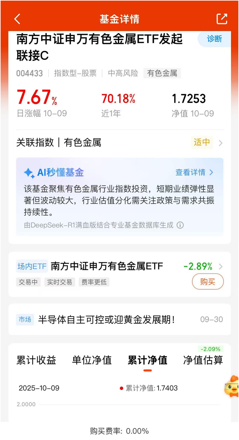 所以对大多数人来说,借道指数基金可能是更稳妥的选择。比如$南方中证申万有色金属ETF发起联接C(OTCFUND|004433)$,这个基金覆盖了贵金属、铜铝铅锌、锂和稀土等多个细分领域的龙头企业,相当于把整个有色金属板块都配置了一遍,能有效分散单一品种波动的风险。从业绩来看,表现也相当不错,昨天一天就涨了7.67%,单位净值达到1.7403,创了近一年新高。短期来看,近一周上涨7.67%,近一个月上涨17.85%;中长期表现更亮眼,近三个月上涨55.74%,近六个月上涨78.69%,近一年上涨70.18%。这样的业绩表现,在同类基金中算是相当优秀的了。