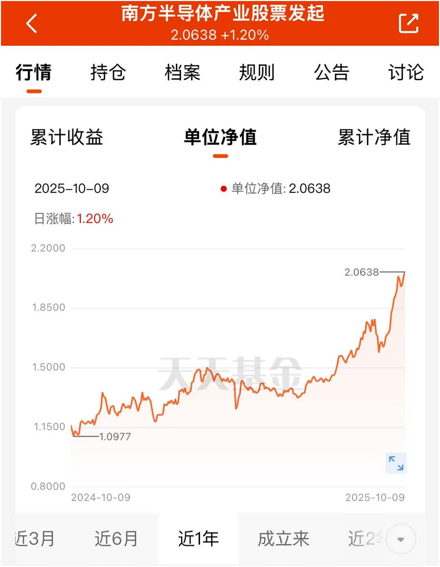 半导体现在确实是布局的好时候,但普通投资者自己选股太难了。做设备的靠技术突破吃饭,做设计的看客户订单,逻辑完全不一样,没几个月研究根本摸不透。不如借道基金,比如$南方半导体产业股票发起C(OTCFUND|020554)$,它专门投半导体自主可控的方向,设备、材料这些国产替代的核心领域都覆盖了。这只产品业绩很亮眼,昨天一天涨了1.20%,单位净值到2.0638,创了近一年新高。