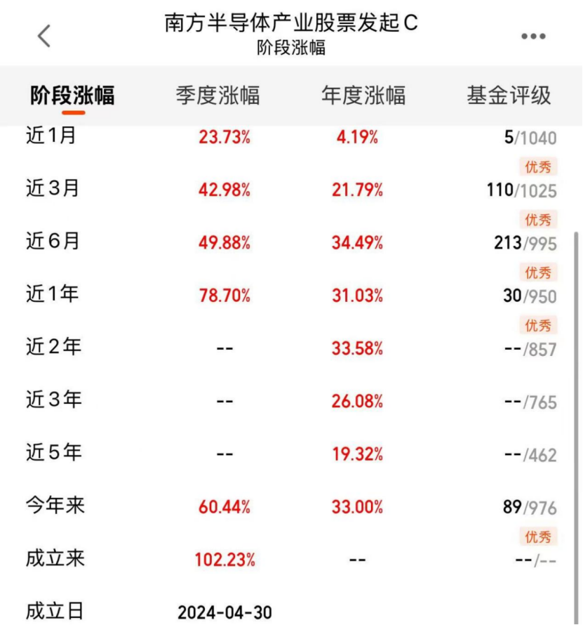 对大多非专业的朋友来说,借道专业机构来布局会稳妥很多。比如南方半导体产业股票发起C(020554),这只产品就是专门投半导体自主可控子行业的,重点盯着设备、零部件、材料、EDA软件这些国产替代的关键领域。现在一方面有AI技术突破带来的需求增长,另一方面有政策支持,这些环节肯定能跟着国产化进程持续受益。而且它的业绩也很亮眼,近1个月涨了23.73%,近3个月涨了42.98%,近6个月49.88%,近1年更是达到78.70%,从成立到现在收益已经有102.23%,直接实现翻倍了,这个成绩在同类产品里算很能打的。