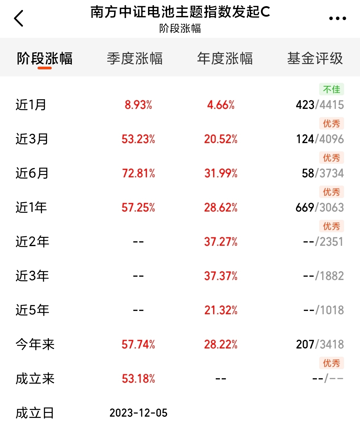 南方中证电池主题指数发起C(018927)就是布局这个赛道的“聪明选择”。这只基金业绩表现亮眼,近1月上涨11.53%,近三月涨54.26%,近6月涨75.75%,近1年涨47.27%,成立以来收益53.66%,行情响应直接高效。更关键的是,它跟踪的是中证电池主题指数,涵盖固态电池产业链上下游龙头公司,既能分享技术突破红利,又能分散个股风险。