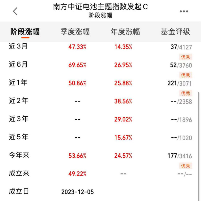 这里可以看看南方中证电池主题指数发起C(018927),这只基金就是深耕新能源领域,专门盯着电池赛道的。业绩表现也很亮眼,近三个月涨了47.33%,近六个月涨68.65%,近一年涨50.86%,从成立到现在也有49.22%的收益,而且短期反弹态势很明显,昨天涨了2.13%,今天看预估还会涨,后续跟着赛道走,潜力还是有的。
