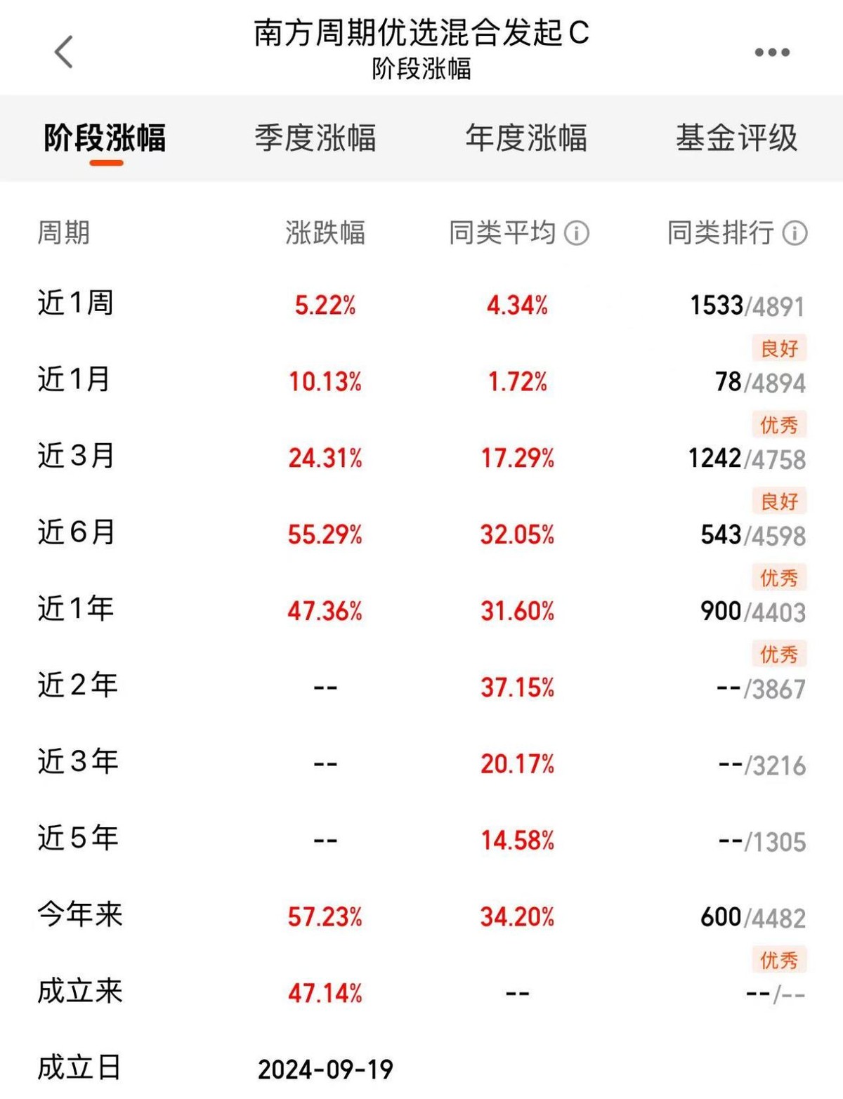 除此之外,$南方周期优选混合发起C(OTCFUND|021712)$(A类021711/C类021712)的配置思路也很清晰,不赌单一品种,而是把传统工业金属(如铜、铝)、战略资源(如黄金、稀土)、新能源材料(如锂、钴)等都纳入组合,形成“防御+进攻”的双重布局,适合不想冒太大风险的投资者。它的业绩也很稳健,近1周上涨5.22%,近1月上涨10.13%,近三月上涨24.31%,近6月上涨55.29%,近1年上涨47.36%,表现同样值得肯定。