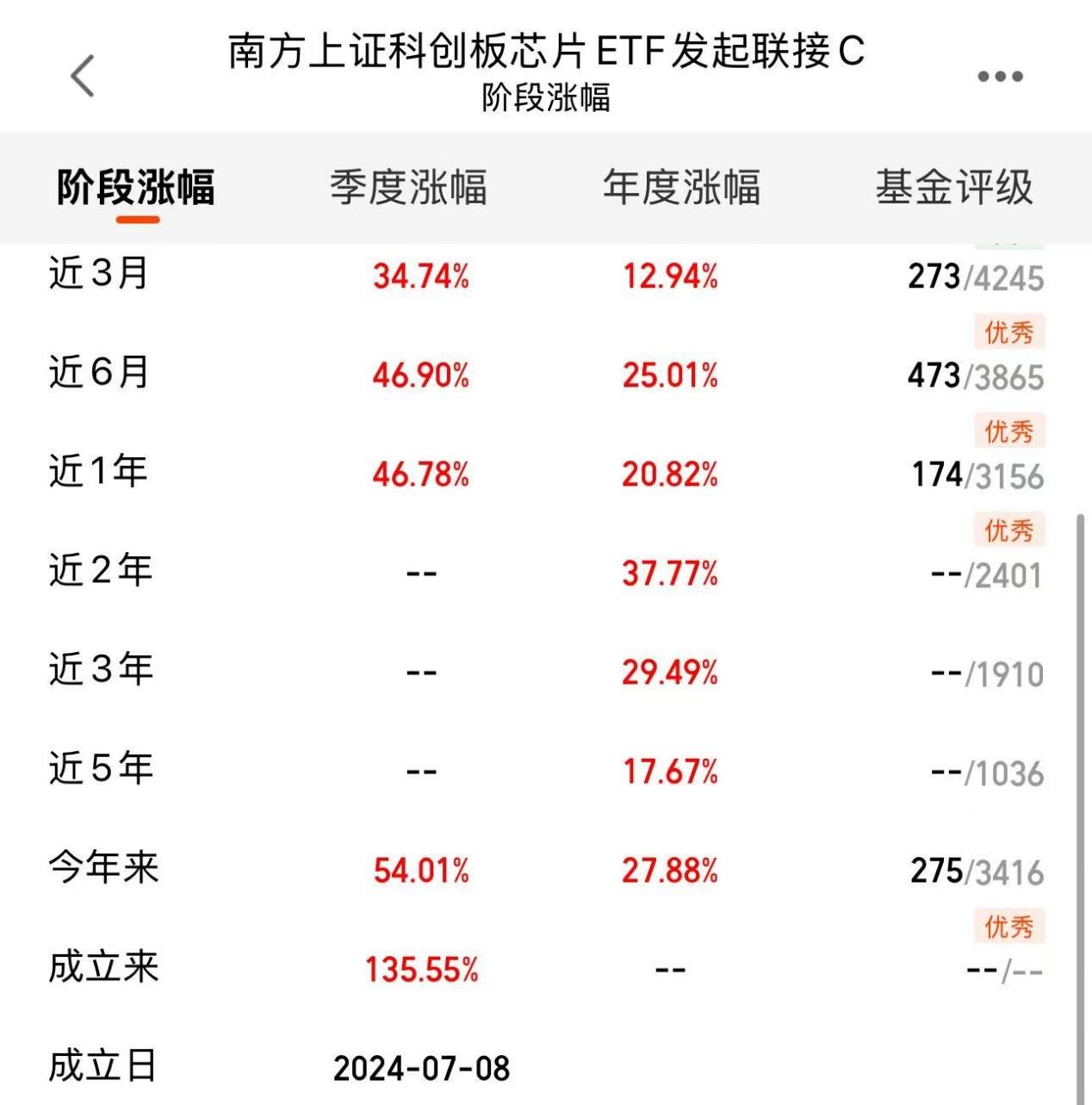 另一只是跟踪科创芯片指数的$南方上证科创板芯片ETF发起联接C(OTCFUND|021608)$,它打包了芯片材料、设备、设计等领域的龙头公司,相当于一键布局国内半导体核心资产。这类ETF联接基金门槛低,几百元就能起步,费率也友好。业绩上,近三个月涨了34.74%,近半年接近47%,成立以来累计收益超过135%,表现比较稳健。