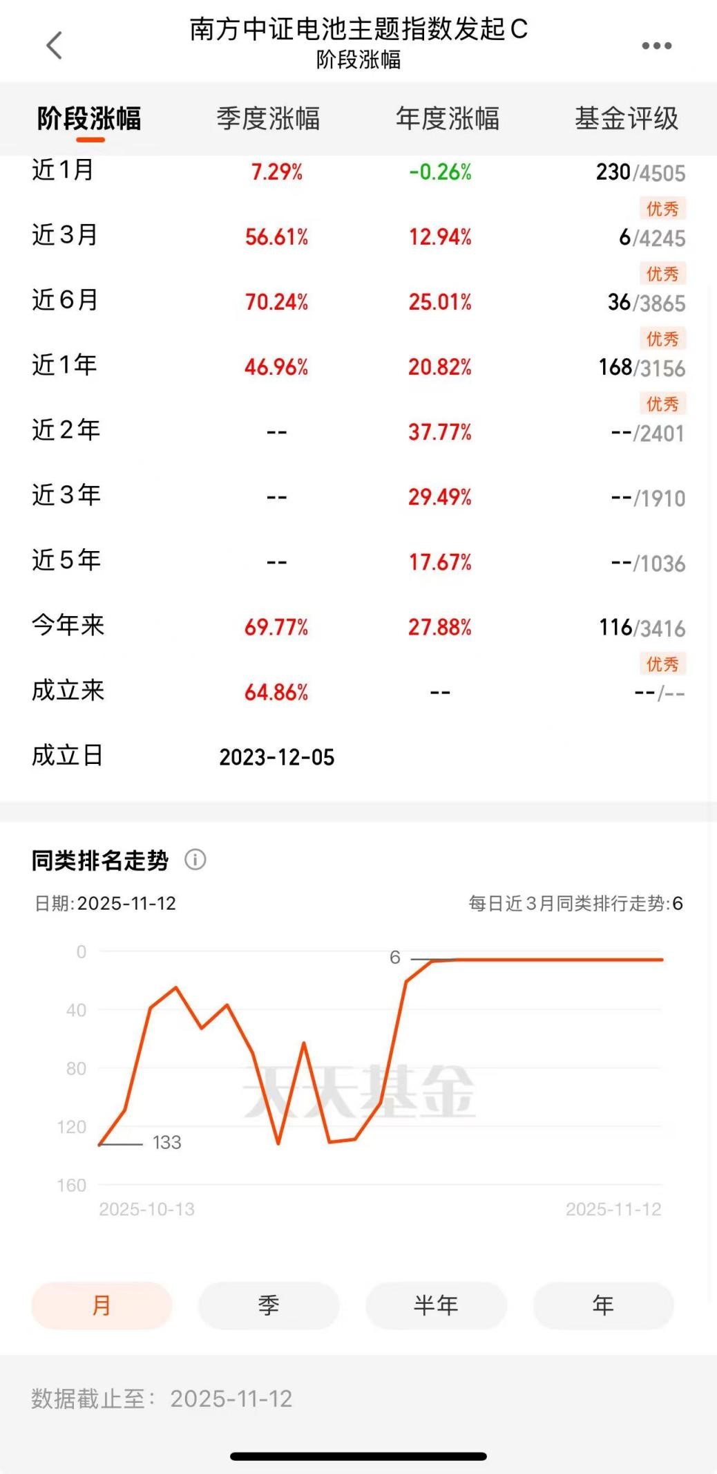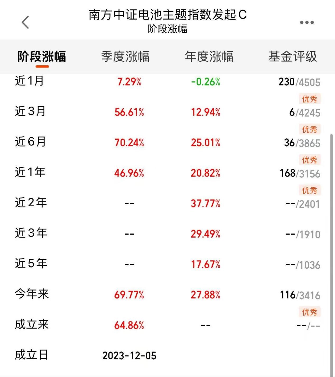 具体到工具选择,我最近在关注两只产品。一是跟踪电池主题指数的$南方中证电池主题指数发起C(OTCFUND|018927)$,覆盖了电池全产业链。近三个月涨幅56.61%,近半年超70%,今年以来收益近70%,成立以来也积累了64.86%的回报,值得注意的是,南方中证电池主题指数发起C(018927)估值上涨强劲,盘中一度涨超6%。对于想参与电池赛道的投资者,这类工具能高效分散风险。
