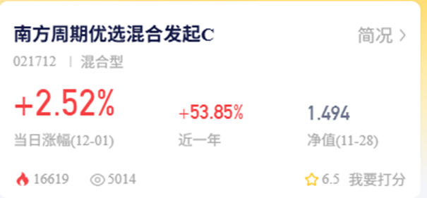 今天有色板块走得挺强势,我一直有关注的那只深耕资源品的基金——南方周期优选混合发起(A类021711/C类021712),涨得很猛。最近已经连涨两个交易日了,今天继续往上走,当下预估上涨2.52%,眼看就要冲击三连阳,势头确实不错。