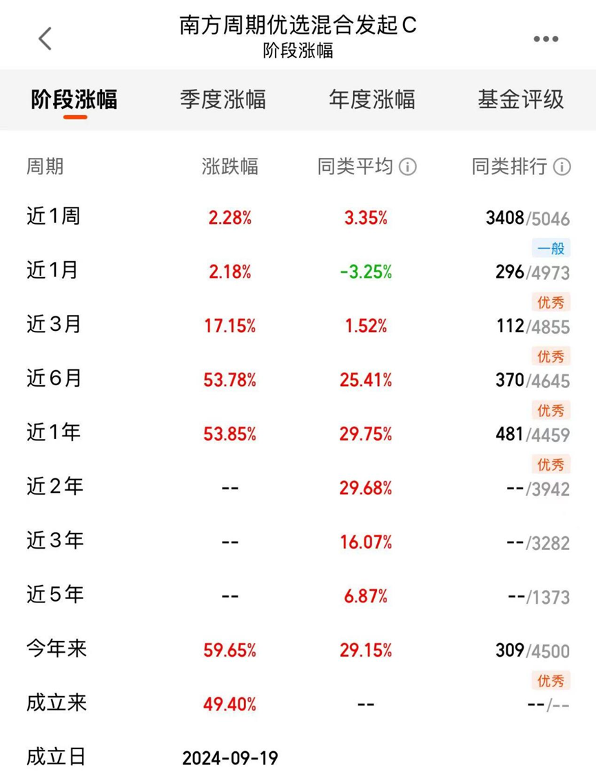 有色板块这波强势上涨,其实说明资源品多个细分领域都有布局机会,现在进场时机刚好。如果不想在场内费力选个股,场外可以看看南方周期优选混合发起(A类021711/C类021712)。这只基金不押注单一品种,思路很清晰,抓住了资源品战略升级的主线,铜铝这些工业金属龙头、黄金稀土等战略资源企业,还有锂钴这类新能源金属的机会都把握住了。业绩也经得起检验,近1月涨2.18%,近三月涨17.15%,近6月涨53.78%,今年以来更是赚了59.65%。