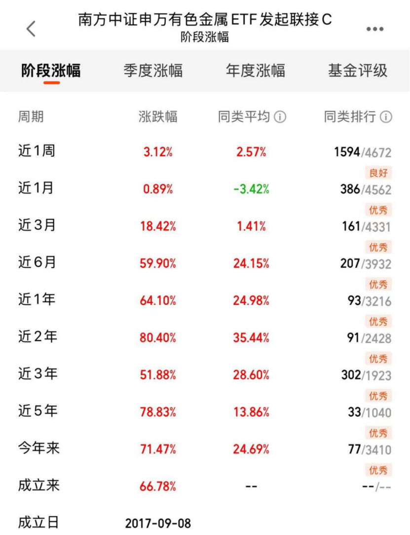有色板块行情强势爆发,如何精巧入局?普通投资者最省心的办法还是借道南方中证申万有色金属ETF发起联接C(004433)。这只基金把黄金、铜、铝、锂、稀土全产业链龙头都包进去了,相当于一键打包整个有色板块的机会。业绩也确实能打:近1周涨3.12%,近3月18.42%,近6月59.90%,今年来更是飙了71.47%,每个阶段都跑赢同类平均一大截。
