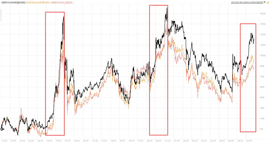 第二点,我们看历史数据说话。今年以来,A500的累计表现确实可圈可点。更有参考价值的是,回顾过去几轮典型的市场上升期,比如2014年到2015年那波,以及2019年初到2021年初的结构性行情,A500的涨幅都显著超越了同期其他主要宽基指数,展现出更强的弹性。历史当然不会简单重复,但如果未来市场情绪真的转向乐观,迎来一段趋势性的机会,那么过往展现出高弹性的指数,其后续表现自然值得多一些关注。