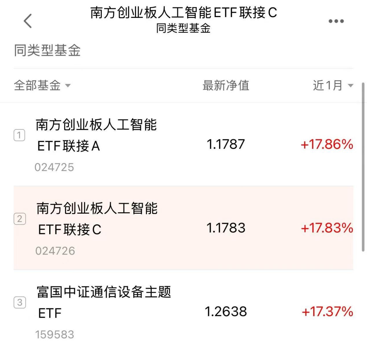 展望未来,业内普遍认为,CPO及AI算力板块的行情远未结束。AI算力需求的爆发正带动高端PCB、CPO等关键零部件进入量价齐升的黄金通道。考虑到中国PCB产业在全球占比已超过50%,本土企业将持续受益于这一全球性趋势。更重要的是,国产AI芯片的市占率正在快速提升,预计到2026年有望超过海外品牌,产业链国产化的明确趋势将为相关企业带来巨大的历史性替代机遇。全球数据中心资本开支未来几年将保持高增速,AI相关需求会贡献超过60%的新增市场增量,这为光模块等细分领域提供了长期支撑。那对普通投资者来说,如何抓住这波AI算力红利?场内可以关注创业板人工智能ETF南方(159382),场外南方创业板人工智能ETF联接C(024726)或许是个好选择。它紧密跟踪创业板人工智能指数,成分股覆盖通信设备、云服务、计算机软件、人工智能等核心领域,其中光模块三大龙头的权重占比超过45%,相当于把算力产业链的核心资产都打包在了一起。这种“一键打包”的方式,既省去了选股的麻烦,又能分享到行业发展的红利。近1周反弹上涨11.51%,近1月上涨17.83%,同类第一!值得锁定!