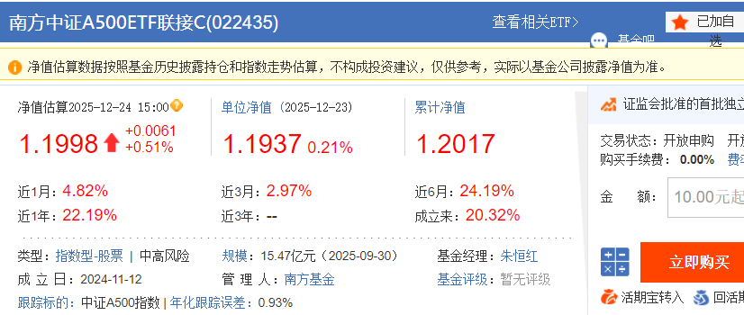 资金的持续流入不仅提高了基金规模的稳定性,也增强了产品的流动性。截至2025年12月23日,南方中证A500联接A的最新净值是1.1964元,近1个月涨了4.83%,近6个月涨了24.32%,近12个月涨了22.44%;C类份额的最新净值是1.1937元,近1个月涨了4.82%,近6个月涨了24.19%,近12个月涨了22.19%,两类份额的业绩表现几乎一致,都精准复制了指数的收益情况。稳定的业绩和充足的流动性,方便投资者申购赎回,有效降低了流动性风险。