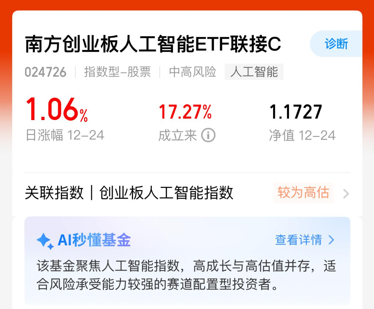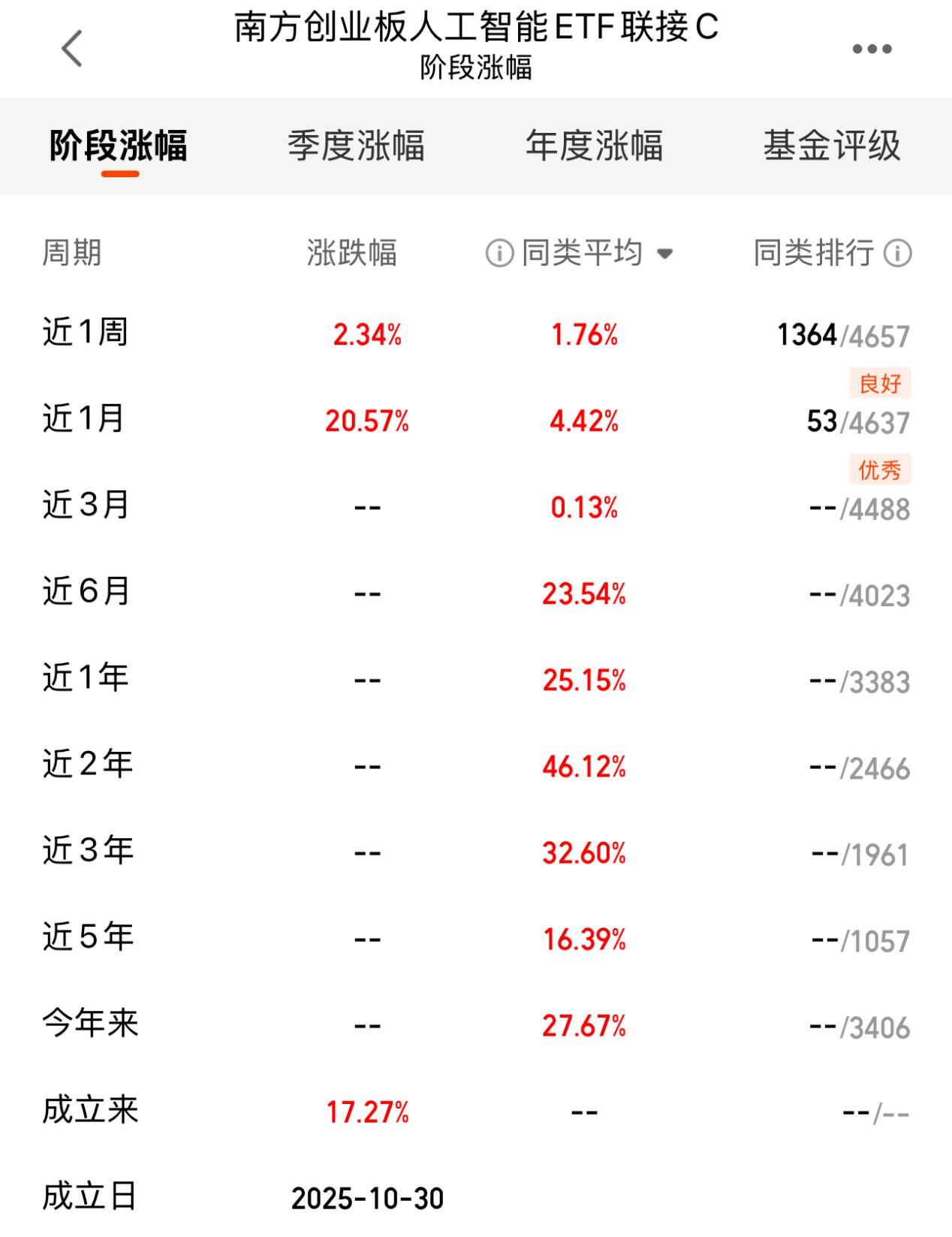 回到具体工具上,光模块行情正在升温,通过南方创业板人工智能ETF联接C(024726)来布局是一个值得考虑的选择。这个产品主要投资于创业板人工智能ETF,它的持仓精准聚焦在人工智能的核心硬件领域,其中就重点涵盖了光模块这些关键环节。这样做的好处很明显,就是帮你一键打包一篮子行业龙头公司,避免了单独挑选个股可能遇到的风险和剧烈波动。从业绩表现来看,也确实不错,近1周反弹上涨了2.34%,近1月更是强势上涨了20.57%,自成立以来已经取得了17.27%的收益,显示了较好的跟踪和增长潜力。
