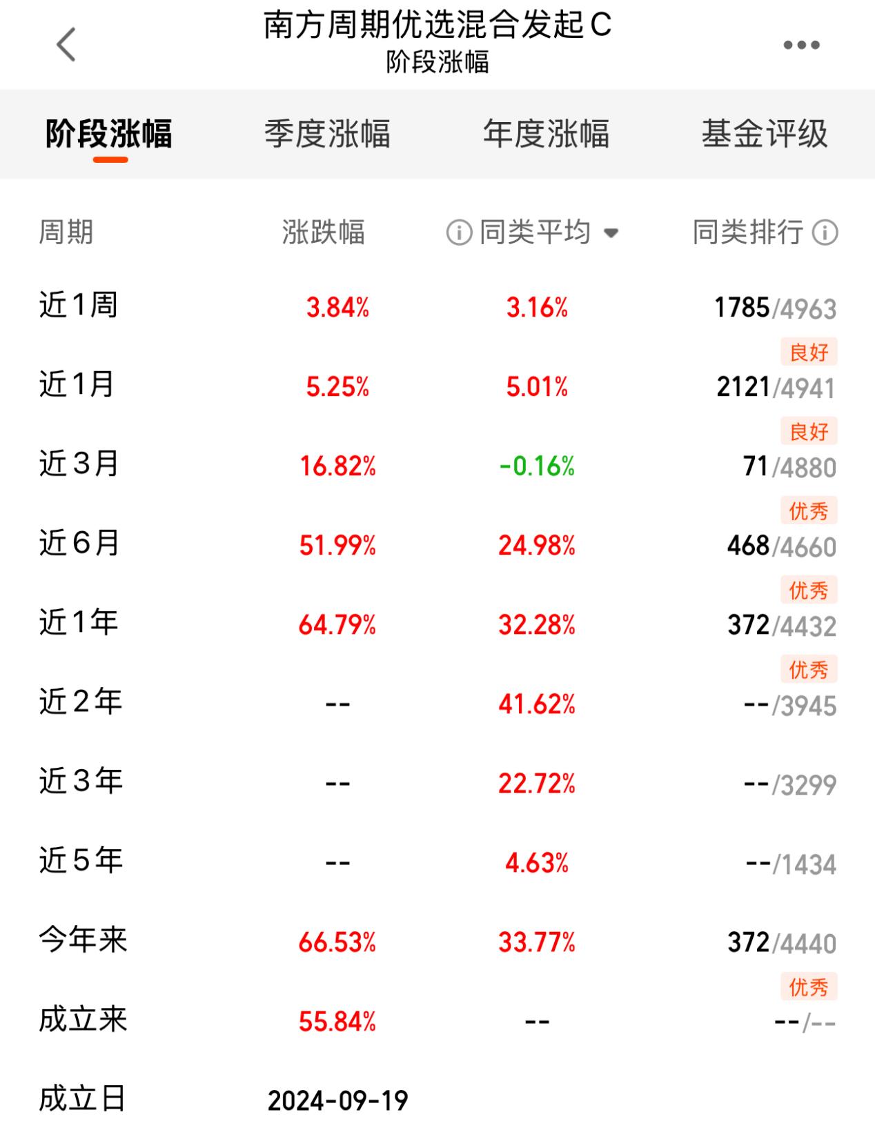 那怎么办呢?我的思路是,不押注某一个具体的金属品种,因为不确定性太大。而是抓住“资源品战略价值提升”这条更清晰、更确定的主线。有只产品,南方周期优选混合发起(A类021711/C类021712),思路和这个比较吻合。它主要就是围绕这条主线布局,聚焦在锂、多晶硅、工业金属这些景气度高的方向上,等于帮你做了一个“一篮子”配置,分散单一品种波动的风险。从结果上看,这个策略最近表现挺扎实。近一周涨了3.84%,把时间拉长看,近一个月5.25%,近三个月16.82%,尤其是近一年64.79%的收益,确实抓住了这波结构的红利。对于看好资源板块,但又不想操太多心的朋友,这种产品是个不错的观察对象。