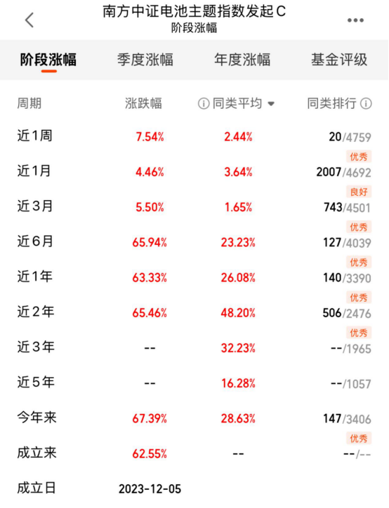 电池板块值得关注,像南方中证电池主题指数基金(018927)就挺合适,该产品紧密跟踪中证电池主题指数,业绩在一众跟踪该指数的产品中表现最佳,近6月第1/6,近1年第1/6(连续八期TOP1)。它覆盖了从锂矿开采到电池组装的全产业链。这个基金有个好处,能自动跟踪产业龙头,要是未来固态电池技术路线明确了,持仓会自动向有突破的企业倾斜,不用我们自己来回调仓。业绩方面更是没话说,近1周上涨7.54%,近3月上涨5.50%,近6月上涨65.94%,近1年上涨63.33%,今年来上涨67.39%,成立来上涨62.55%收益!