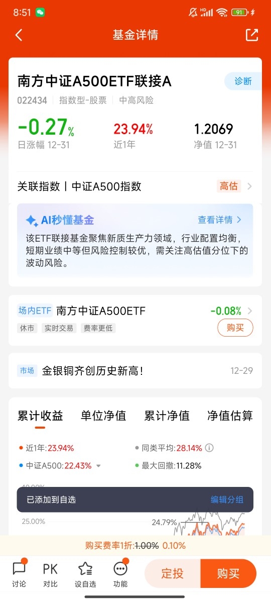 而且,这只南方中证A500ETF联接C的业绩,从来没有让我失望过。翻看它的过往收益,近一年稳稳上涨24%,这份收益,不算惊天地泣鬼神,却足够扎实,足够碾压多数盲目布局的投资者。更难得的是,它是联接C类基金,无需申购费,持有一段时间后免赎回费,对于我这种长期持有、偶尔适度加仓的专一派来说,能省下不少手续费,长期下来,这也是一笔不容小觑的收益。