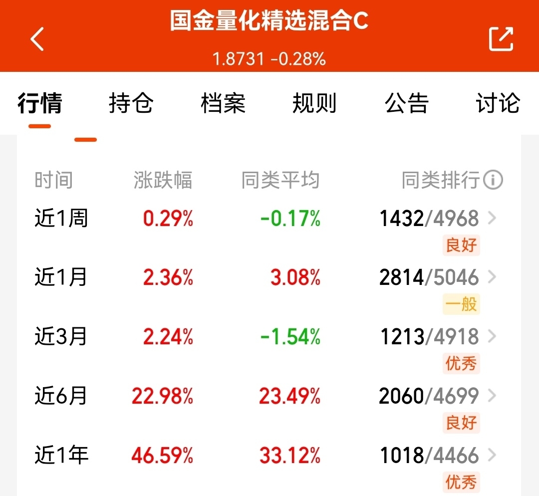 今天行情不错,最近$国金量化精选混合C$限额放开了,各阶段业绩都比较稳,和国金量