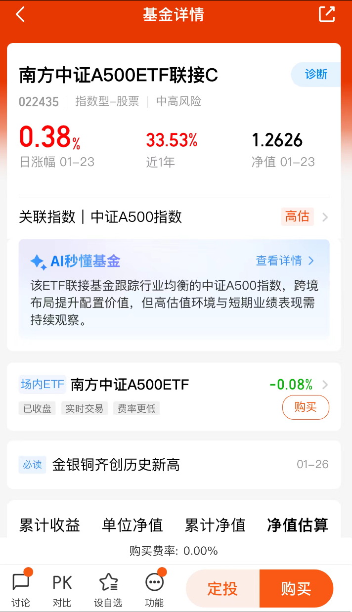 该基金分为A(022434)、C(022435)份额,均紧密跟踪中证A500指数,成立以来净值表现与指数高度贴合:截至2026年1月23日,C类份额成立以来涨幅27.26%,近一年涨幅33.53%,完全复制了指数的收益表现。