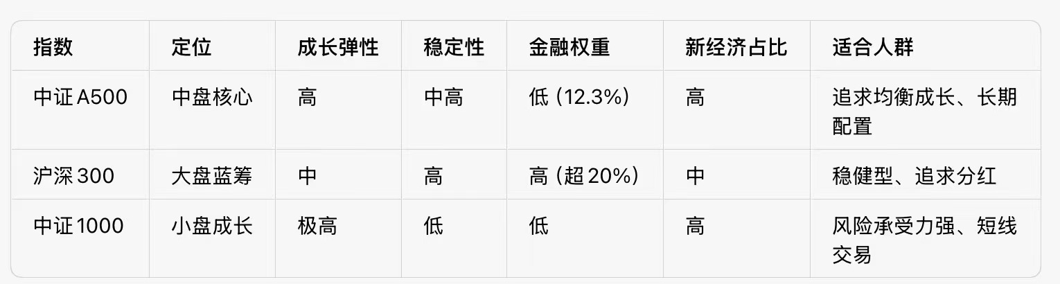 1. 中盘定位,兼具弹性与稳定性:相比沪深300(大盘蓝筹),A500在成长阶段、业绩弹性上更优;相比中证1000(小盘),A500流动性更好、波动更可控,适合长期配置
