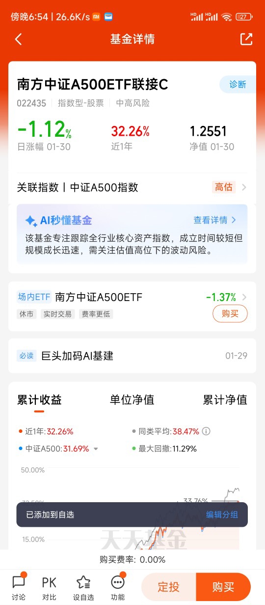 对于普通投资者而言,南方中证A500ETF联接C的产品设计,让“专一”投资变得更加便捷可行。作为场外联接基金,它无需港股账户或股票交易权限,1元起购的低门槛让小额资金也能参与宽基指数的长期增长;而C类份额无申购费、持有7天后赎回费为0的费率结构,极大降低了中长期持有成本,特别适合定投布局。从业绩表现来看,这只基金近6个月涨幅19.81%,近12个月涨幅达32.26%,在市场波动中展现出强劲的赚钱效应。对我而言,选择它并非追求短期暴涨,而是看中其背后指数的长期逻辑:随着注册制深化推进,A股优质中小企业的成长价值将逐步凸显,而中证A500作为覆盖这些企业的核心指数,有望在经济转型周期中实现“戴维斯双击”。