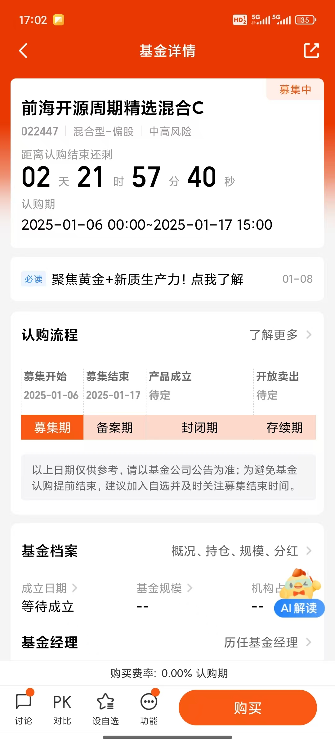 我已将$前海开源周期精选混合C$加入自选,它在2025年1月6日就会正式发售,基金将采取“一手黄金,一手周期成长”的投资策略,把握优势行业,重在立足周期“顺势而为”,是我2025年特别关注的新基金!#我的2025理财搭子#