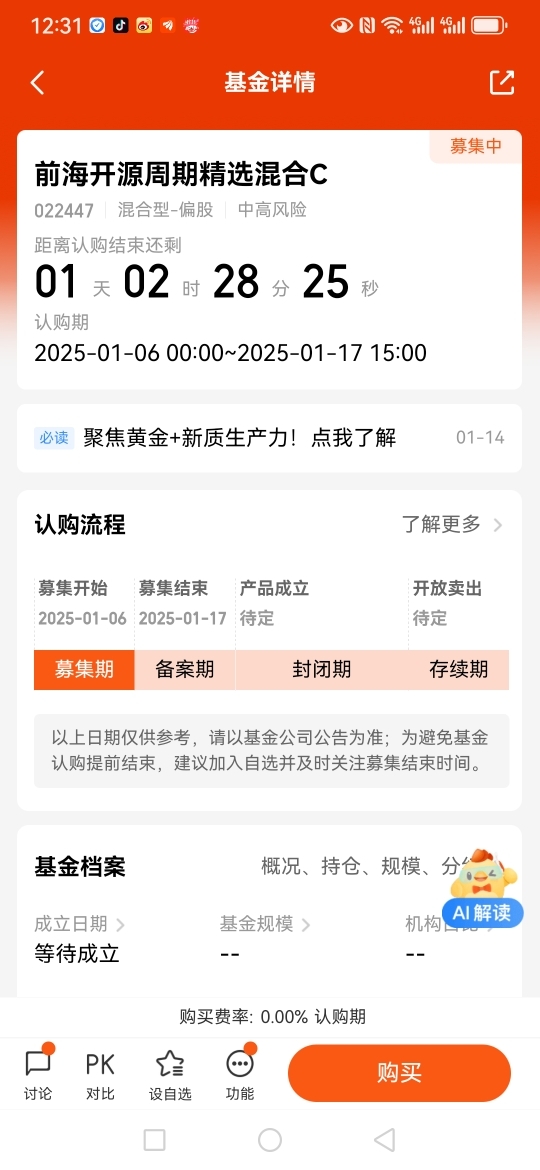 所以,现在黄金接下来涨跌是不是一目了然了呢?有了结论,就赶快上车吧,但是如果选择单一黄金赛道的基金上车,如果金价发生波动(毕竟近两年涨幅很大)就被动了。现在好了,$前海开源周期精选混合C$布局黄金和新质生产力两个赛道,可以对冲风险,可以积极参与。