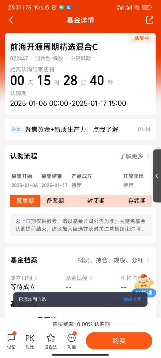我已将$前海开源周期精选混合C$加入自选。