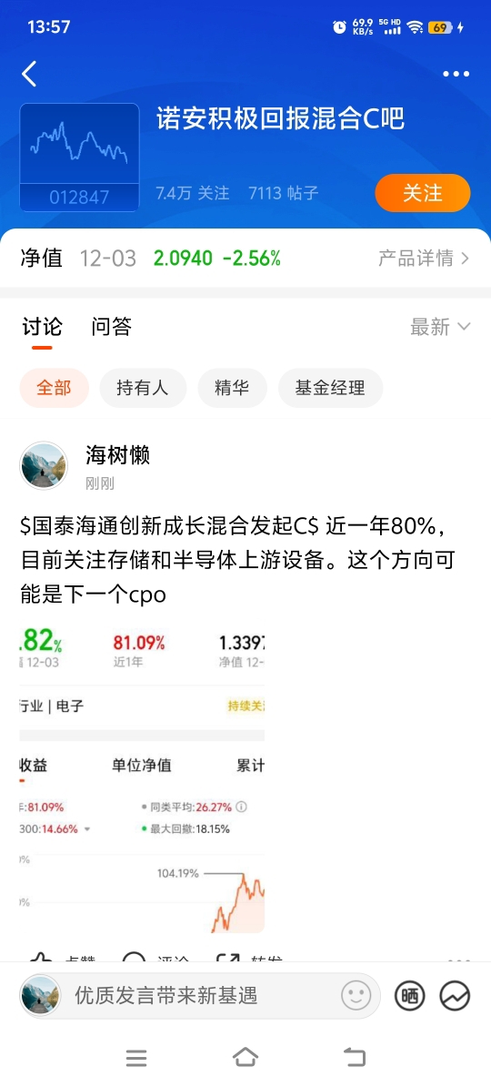 $国泰海通创新成长混合发起C$近一年80%,目前关注存储和半导体上游设备。这个方