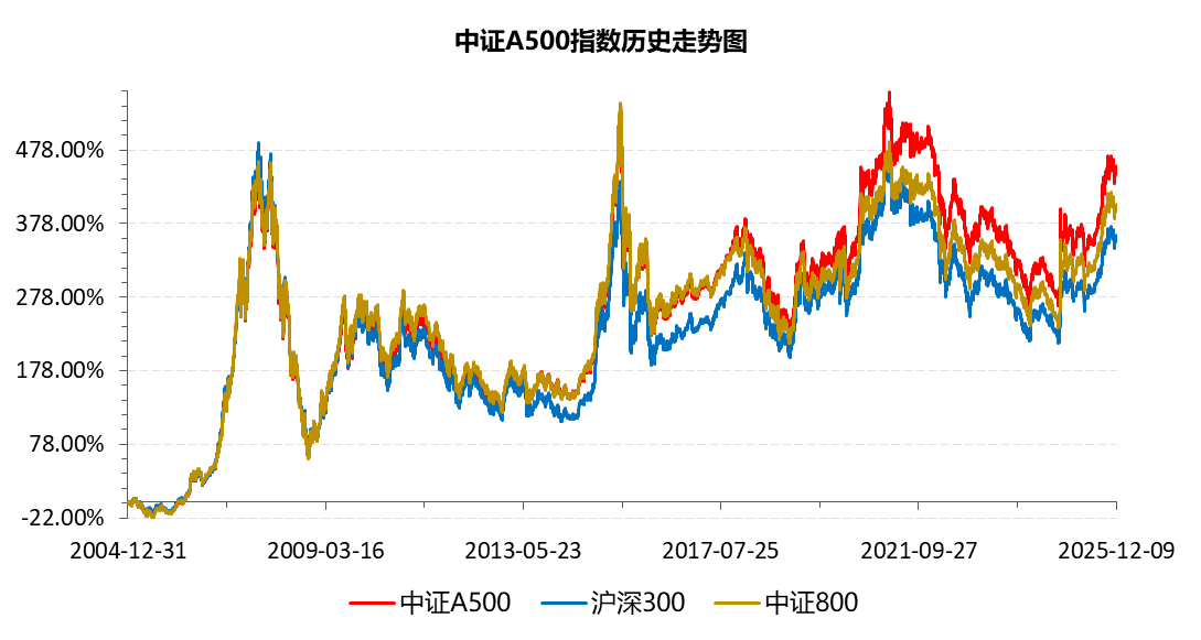 Wind数据显示,截至2025年12月9日,中证A500自基日以来涨幅高达453%,相对沪深300的超额回报达93%。2025年以来,涨幅达19.98%,同样领先同期沪深300和中证800涨幅。