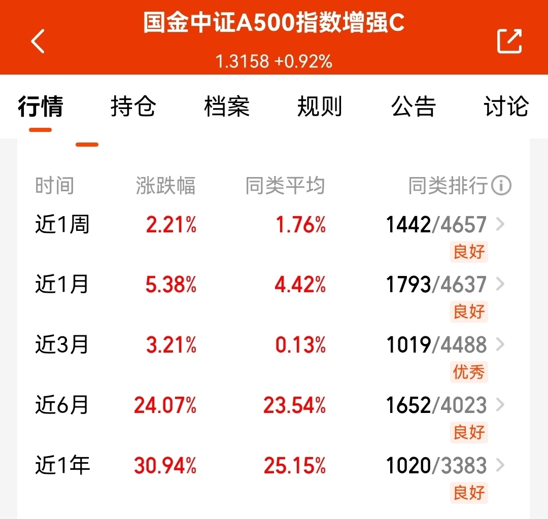 今天不错,还拿了些$国金中证A500指数增强C$ ,今天也涨了近1个点,各阶段业绩都挺稳健的