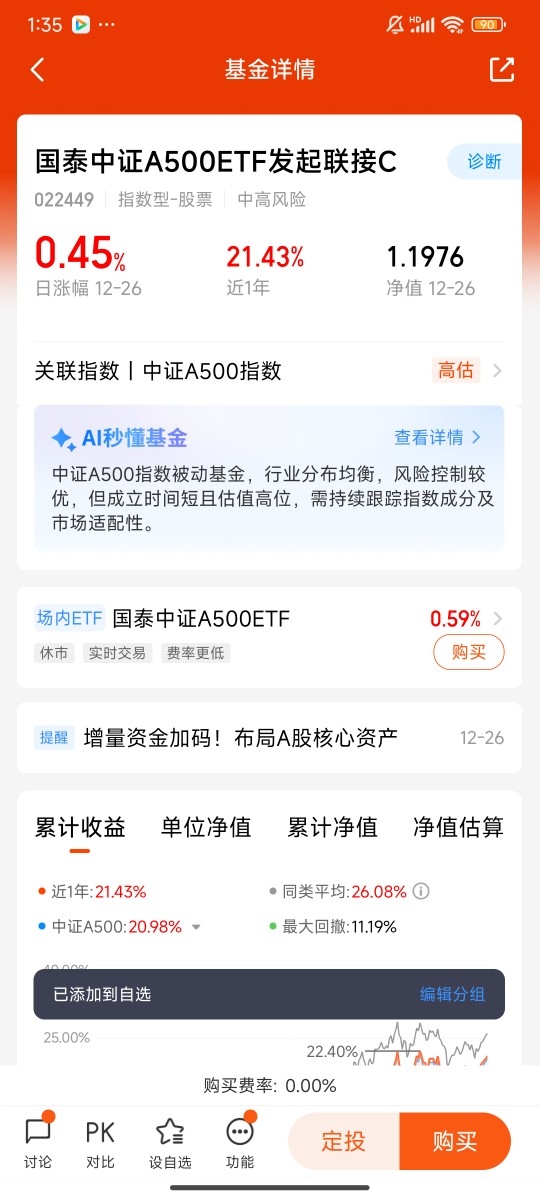 最后说说当下的布局时机,年底的市场往往会迎来资金面和政策面的双重利好,跨年度行情的窗口已经悄然打开。对于普通投资者来说,不需要去追逐那些涨势过猛的热门赛道,也不需要耗费精力去研究个股,选择一只优质的宽基基金进行布局,就是最省心、最有效的方式。国泰中证A500ETF联接基金,既有低费率的成本优势,又有灵活的赎回规则,还有优质指数和靠谱基金公司的双重加持,完全符合我对“资产压舱石”的所有期待。