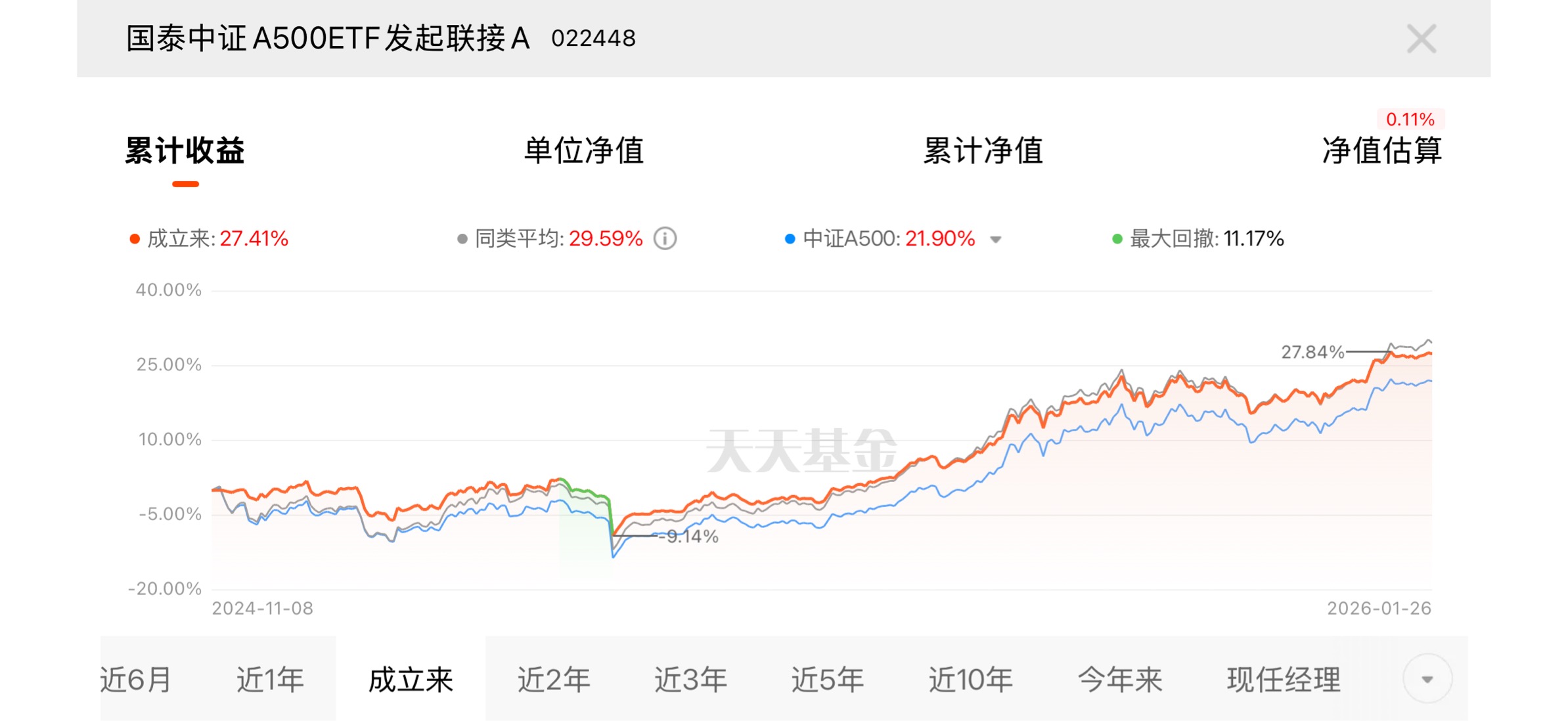 我自己也深度思考了一下,觉得与其在两边纠结,不如找个更省心、更均衡的办法。我既没有精力去精确搭配资产组合,也怕自己追涨杀跌,所以干脆选择了一个最简单、甚至有点偷懒的方法——从今年年初开始,定投跟踪中证A500指数的国泰中证A500ETF联接基金(A类代码022448,C类022449,还有低费率的I份额022610)。