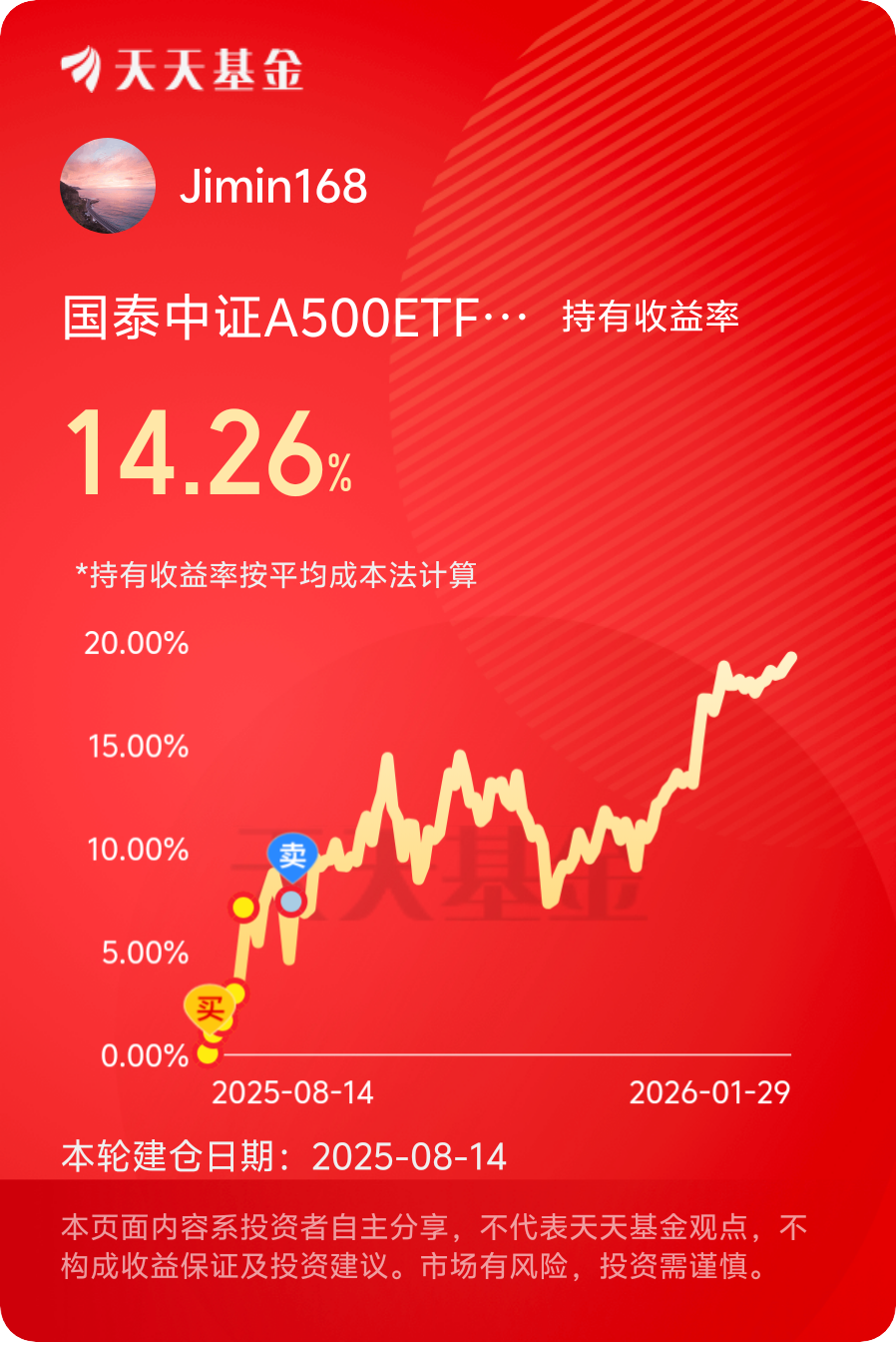 首批A500指数产品,规模领先、流动性佳;管理费0.15%+托管费0.05%,费率处于同类最低档;有ETF、联接A/C、养老Y份额等全产品形态,适配不同投资渠道;国泰基金宽基管理经验足,跟踪误差小,投研支持专业。$国泰中证A500ETF发起联接I$ #晒收益#