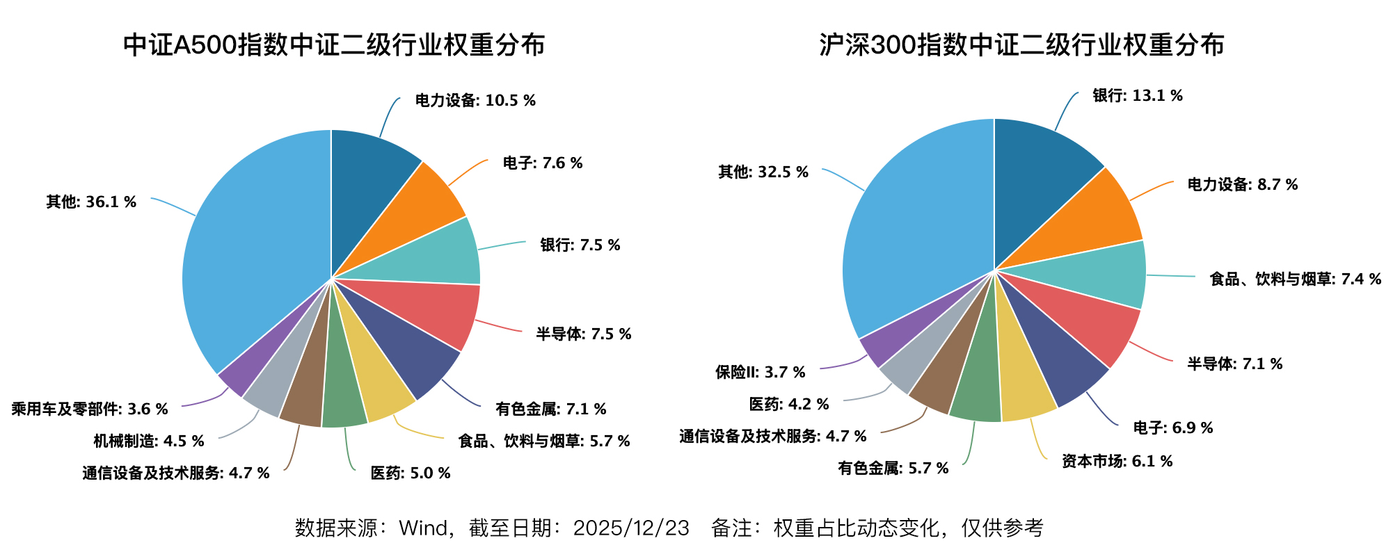 从中证二级行业权重分布来看,中证A500相对于沪深300,超配电力设备、电子、半导体、医药、通信设备及技术服务等新兴行业,低配银行、保险、食品饮料等传统行业。这种兼具核心资产稳健性和新质生产力成长性,司令感觉它属于那种天然带有“哑铃风格”的大盘宽基。