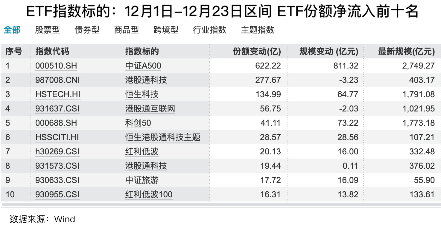 Wind统计显示,今年12月1日-12月23日区间,中证A500指数“吸金”能力排名第一,大幅净流入622.22亿份,规模净增811.32亿元,或是长线资金共同看好中国核心资产的佐证。此外,多只科技和红利主题指数净流入靠前,或预示着板块震荡分化仍将是主旋律,哑铃式配置依然是明年较稳妥的策略。