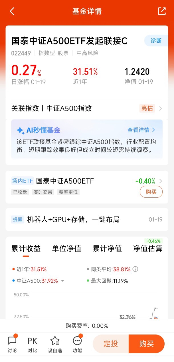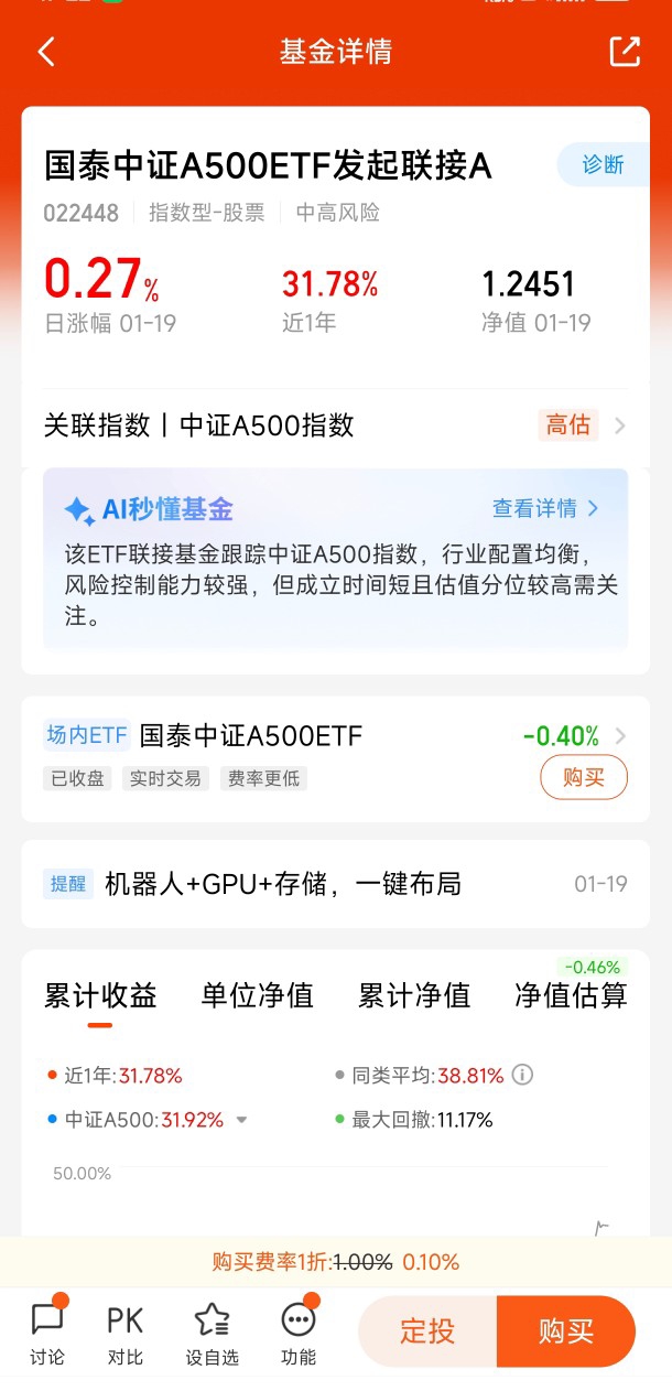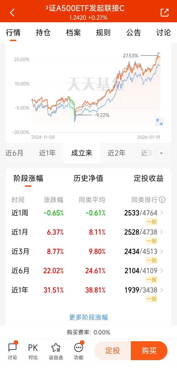 而国泰中证A500ETF联接C基金,就像是一位贴心的“美食顾问”,帮你从500道菜中选出最合适的组合,让你无需自己研究每道菜的配料和做法。截至2026年1月14日,这份“全家桶”自2024年11月8日“开业”以来,已经为食客们带来了26.58%的回报率,证明其“厨艺”确实不俗。