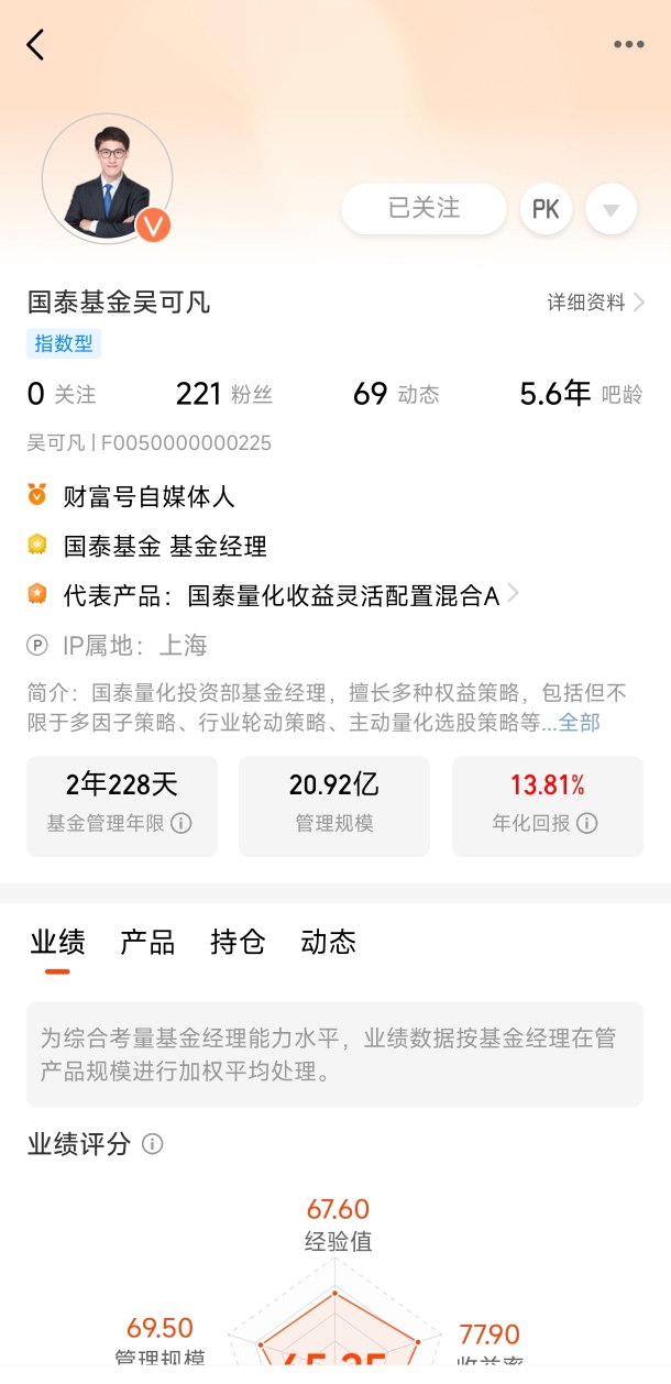 基金的基金经理吴可凡是典型的“量化派”,于2019年加入国泰基金,从研究员做起,至今管理着包括半导体、机器人、智能汽车、黄金产业等多只主题ETF联接基金。