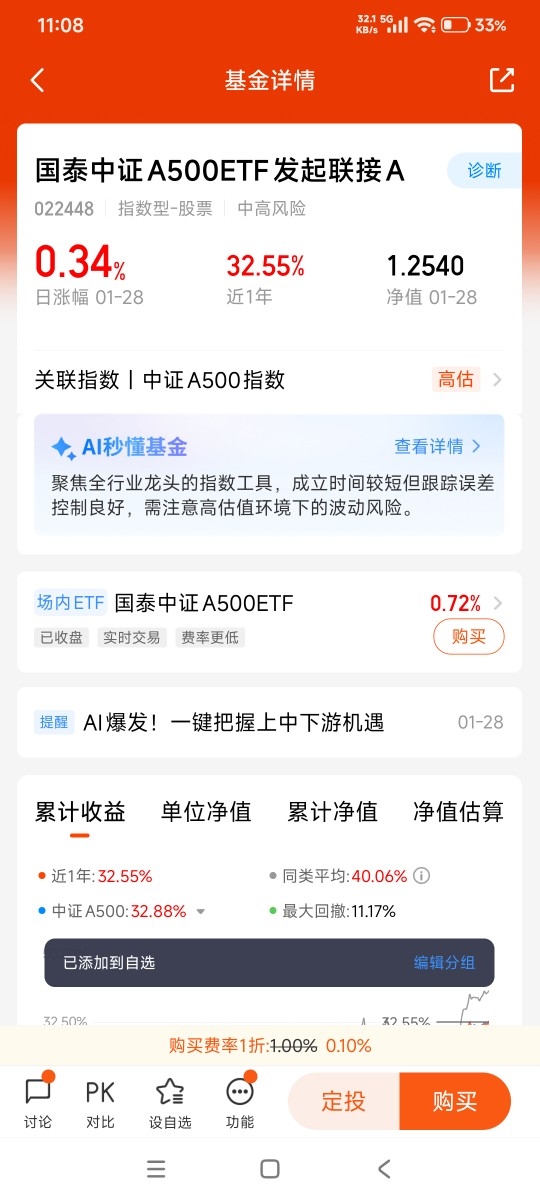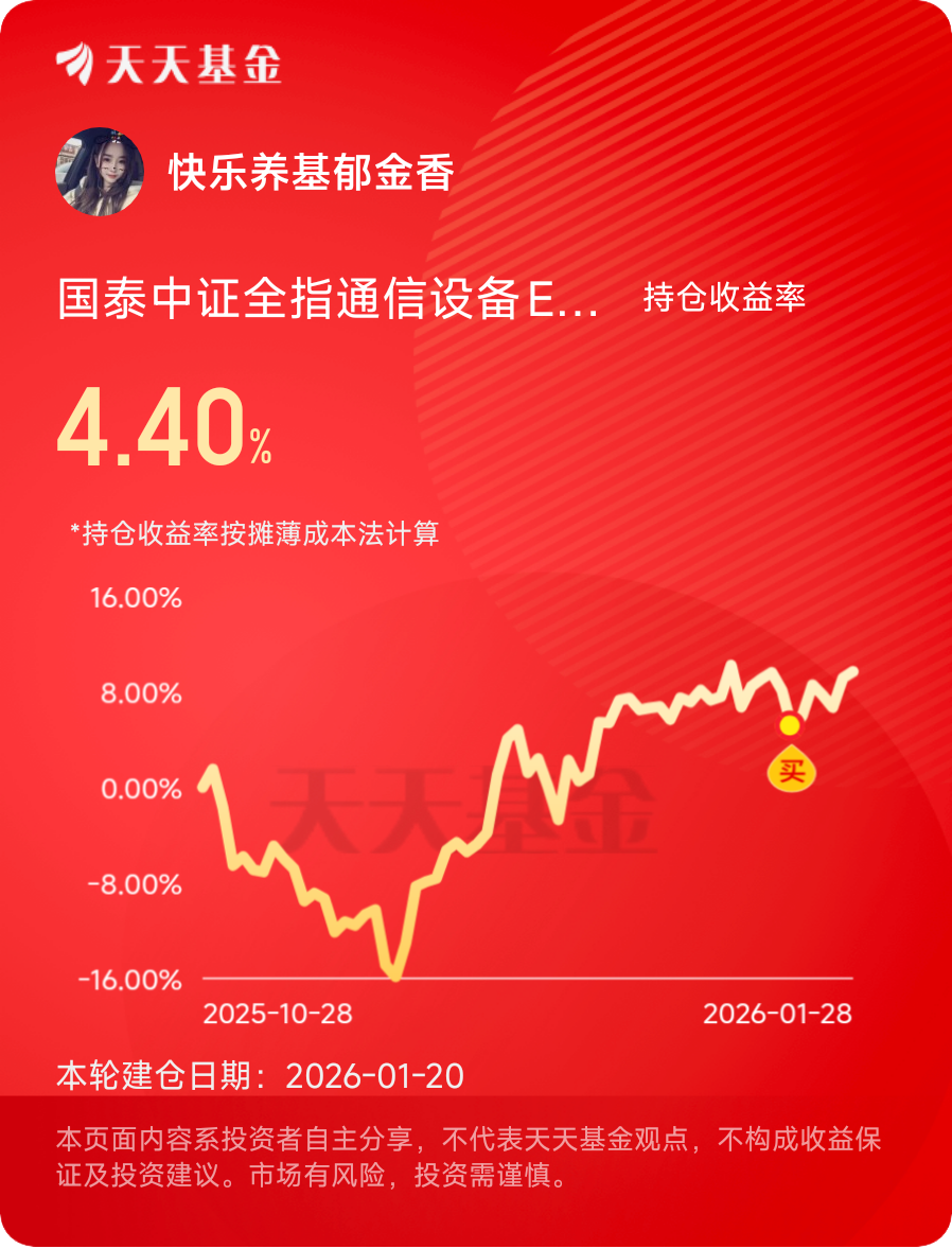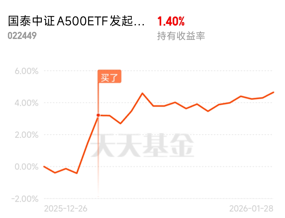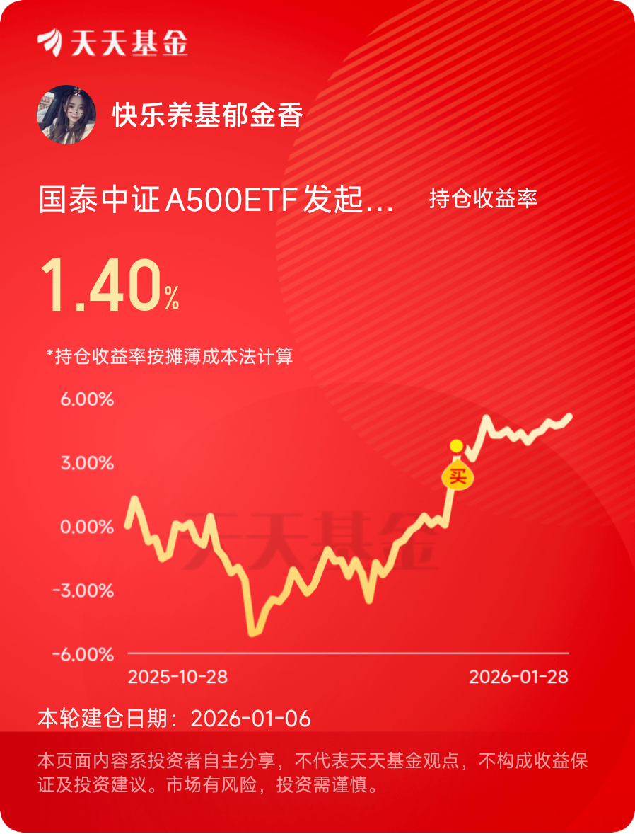 其实,跨年行情就像节日烟花,绚烂却短暂。真正重要的是长久陪伴的工具。国泰中证A500ETF联接发起式C用低费率和广泛覆盖,给了我省心选择。不必整天盯着屏幕,也不必焦虑风向变换,国泰中证A500ETF联接发起式C自在地待在账户里,静静生长。这种模式,反而让我更专注生活本身。周末遛弯,陪家人聊天,甚至读本闲书,都因国泰中证A500ETF联接发起式C的存在而更从容。均衡不是平庸,而是智慧的沉淀。国泰中证A500ETF联接发起式C正用自己方式,讲述这个简单道理。未来还长,带着国泰中证A500ETF联接发起式C,一步步往前走,风景自在途中。#晒收益#