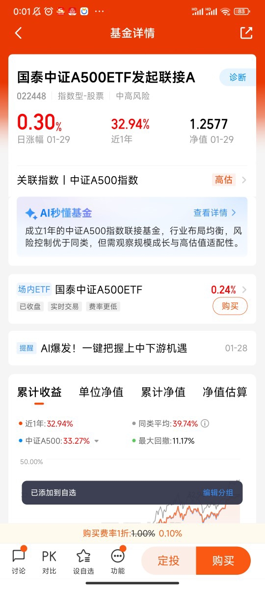 考虑到跨年行情可能存在短期波动,建议采用“分批定投+逢低加仓”的方式布局。每月固定日期投入固定金额(如工资到账后投入1000-3000元),摊平持仓成本;若市场单月回调超10%,可适当增加加仓金额,把握低位布局机会。场外投资者可选择国泰A500联接基金,场内投资者可直接交易ETF,交易成本更低。