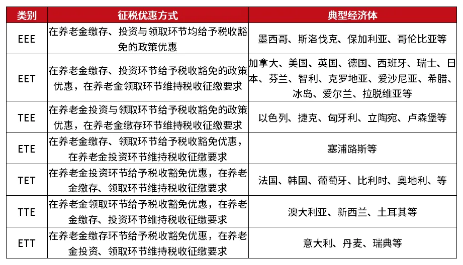 1 税收优惠政策方面,养老金第三支柱资金在缴存、投资和领取阶段享受税收减免方式区分,存在七种主要的税收优惠模式。