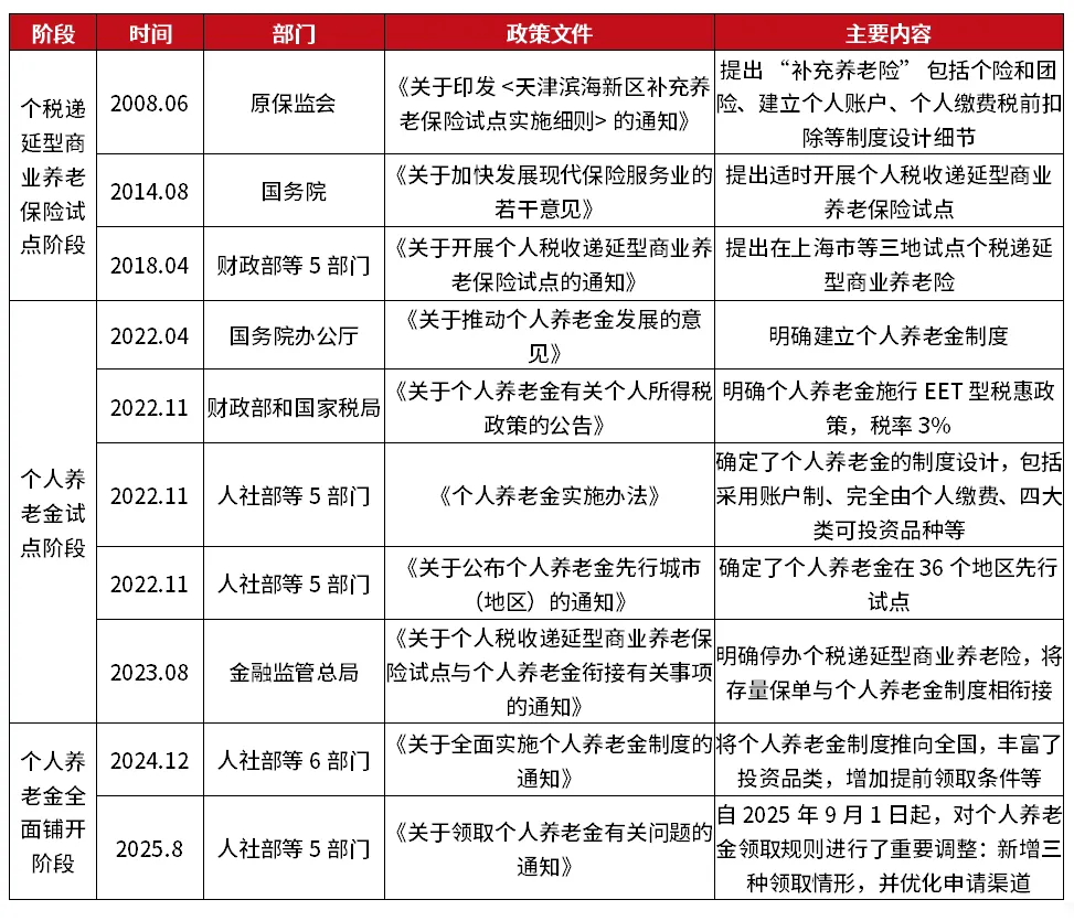 我国个人养老金制度经历由局部试点到全国实施的系统化推进。2018年,个税递延型商业养老保险启动试点,初步探索税收激励与账户模式;2022年4月,国务院印发《关于推动个人养老金发展的意见》,正式确立第三支柱制度框架,并于同年11月配套出台EET税收优惠、账户制管理、36城先行实施等细则;2023年完成税延险与个人养老金制度衔接;2024年12月在全国范围内正式推行。