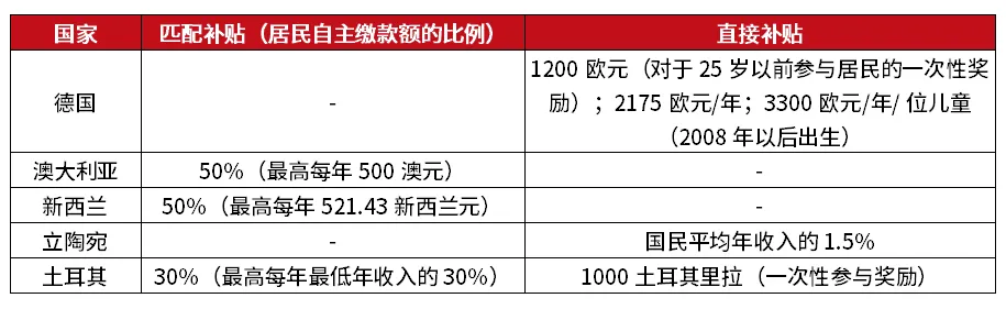 匹配补贴:政府根据居民向养老金第三支柱自主缴纳资金规模的大小,匹配并给予一定比例的财政补贴,常见的匹配比例有20%(哥伦比亚、捷克、匈牙利)和50%(澳大利亚、智利、新西兰)两种。